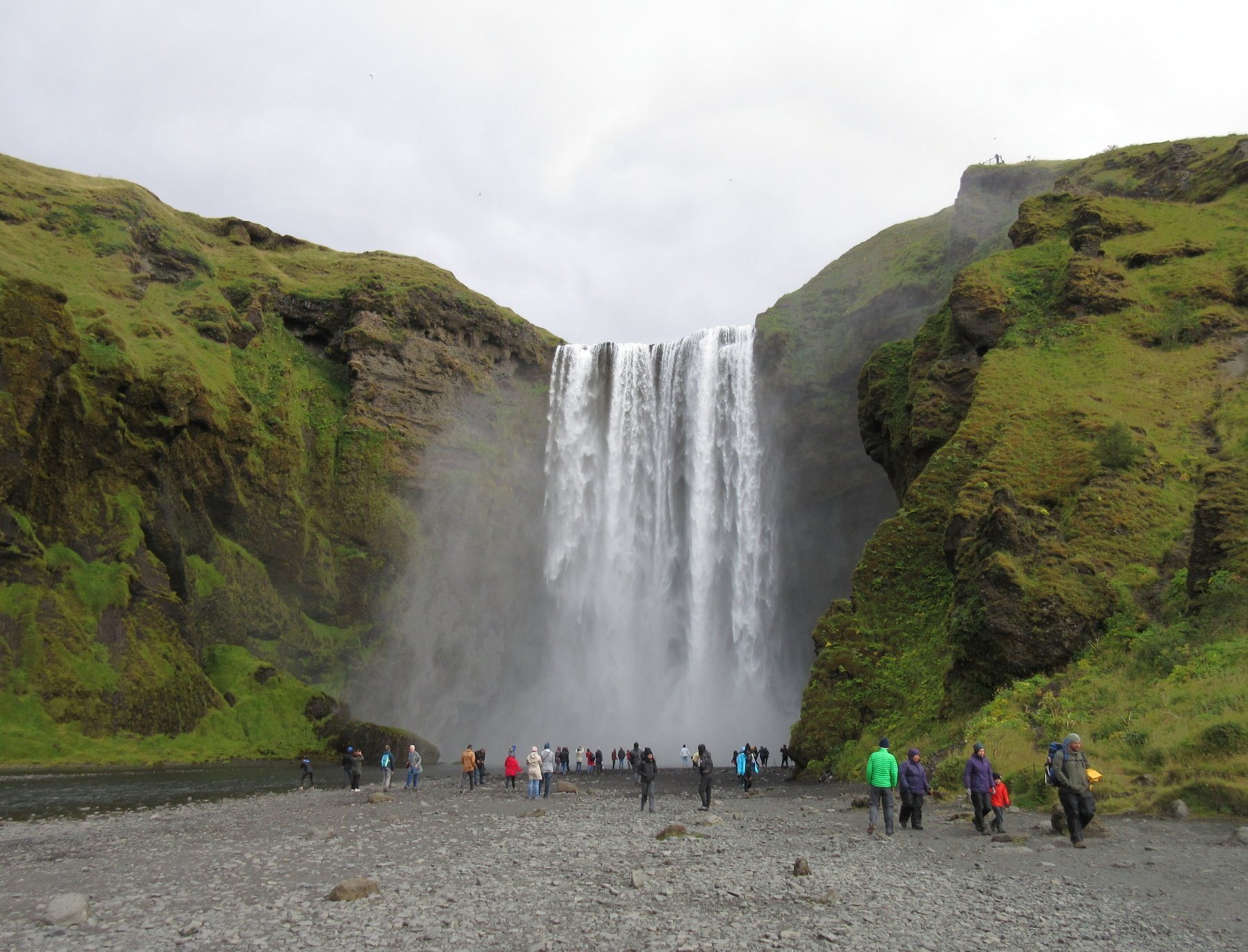 Na vzdálenější straně od kempu je ten nádherný vodopád Skógafoss (v překladu Lesní vodopád). Píšou o něm, že je to nejkrásnější a nejimpozantnější vodopád. Myslím, že mají pravdu. Obrovský proud vody padá ze skály z výšky 62 metrů. A protože jsme měli štěstí a svítilo nám sluníčko, tak mlžný opar vytvářel téměř neustále nádhernou duhu.