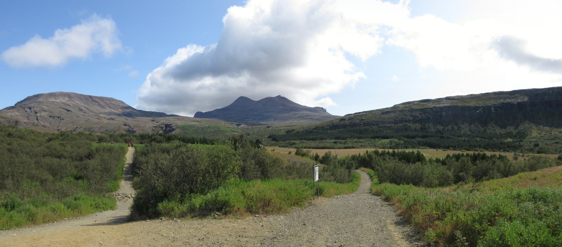 informační tabule Glymur og Leggjabrjótur. Dál se už nechá jít pouze pěšky. Okruh je dlouhý asi 6,5 km s převýšením skoro 400 metrů.