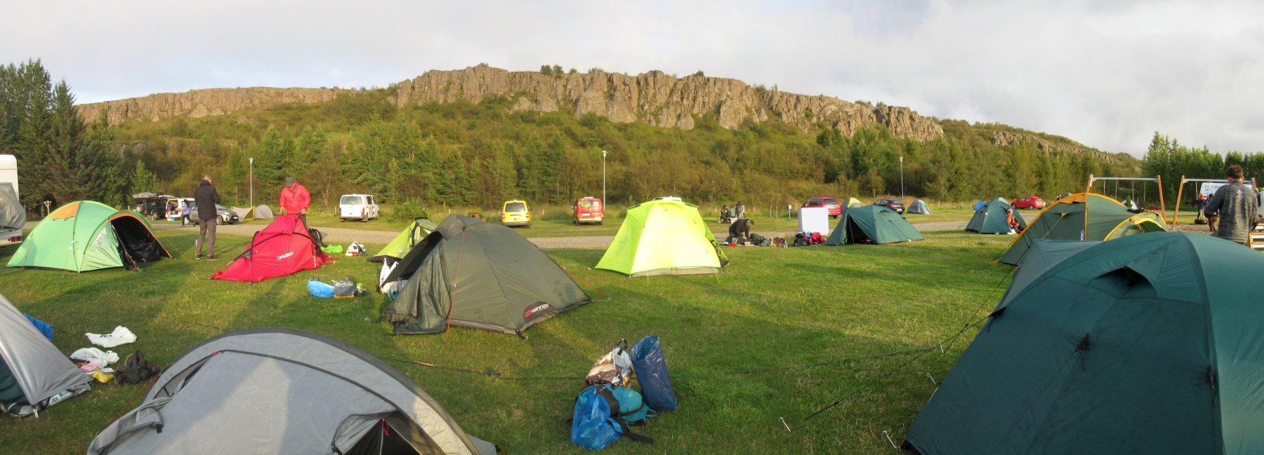My jsme dvě noci spali v perfektně vybaveném kempu na jižním okraji města v ulici Kaupvangur. Je tam velké informační centrum, kde je několik stolků se židličkami a kde je možno se krásně v teple najíst. To jsme v tom studeném, deštivém a větrném počasí ocenili. Jen vařič se nesmí uvnitř používat. Je však k dispozici velké množství zásuvek, několik rychlovarných konvic, je tam toustovač a mikrovlnka, to vše zdarma. Zdarma jsou i vytápěné sprchy s teplou vodou. Za poplatek je možno použít pračku i sušičku. S infocentrem sousedí kavárna Kaffi Egilsstadir. Je tam prý i půjčovna kol, dětské hřiště i wifi.