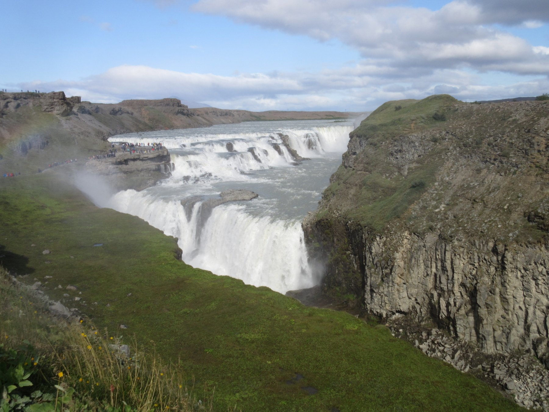 U vodopádu jsou dvě parkoviště. Jedno menší je nedaleko kaňonu, ve kterém voda teče. Tady nás autobus vysadil. Odtud se nechá po cestičce projít okolo druhé kaskády až k té první, prakticky až na úroveň horní hladiny řeky. Jak se voda rozstřikuje a do toho fouká vítr, tak je všude mokro, někdo jde i v pláštěnce. Je to však krása a pěkný rachot. Svítí nám sluníčko, které s vodními kapičkami tvoří nad vodopádem duhu.