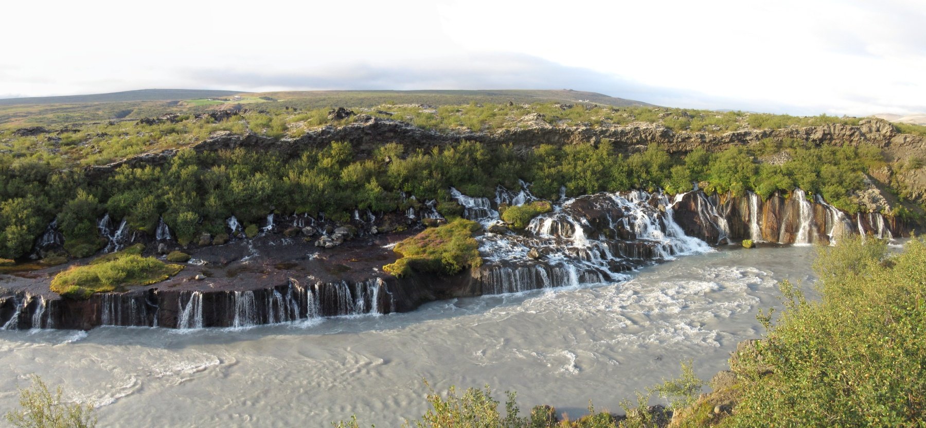Nejdřív jsme se šli podívat k Hraunfossaru. Není to obyčejný vodopád, ale lávový. Takový je snad možno vidět jen na Islandu. Je úžasný a široký. Velké množství potůčků si našlo cestu v lávovém poli, které vyteklo ze sopky z pod ledovce Langjökull. Láva je velmi pórovitá, umožňuje, aby se voda prodrala i zpod lávy a tvořila tak kaskády přes neobvykle tvarovaný lávový povrch. Láva je však poměrně měkká a tak si voda v nich svá koryta snadno prohlubuje. Změny jsou prý znát již po 10 letech. Voda vytéká od ledovce Langjökull a vlévá se do řeky Hvítá. Nádherné to musí být i v zimě, kdy je povrch místy pokrytý sněhem a ledem. Vodopád je od r. 1987 chráněným místem z důvodu neopakovatelné přírodní scenérie. Býval i vyhledávaným cílem islandských umělců.