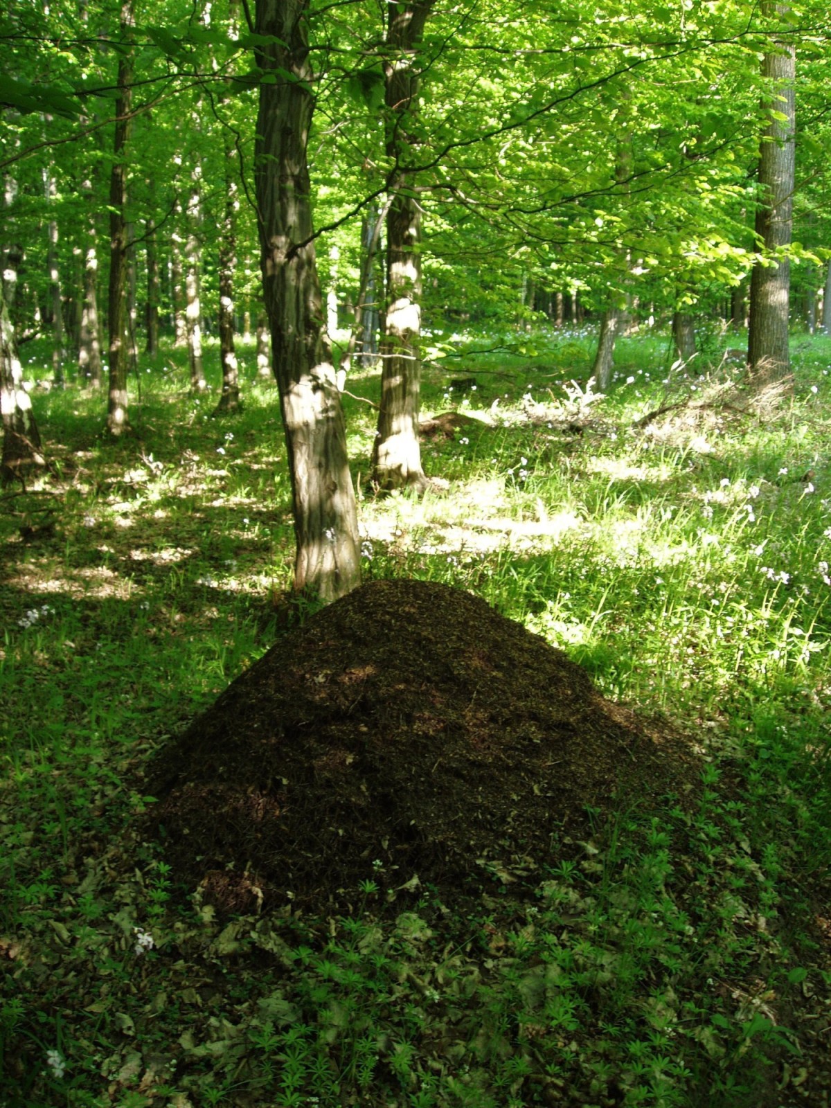 Obrovská lesní mraveniště v lesích Orlovické pahorkatiny a výhled z kopce Hradisko (518 m n. m.) na Chřiby.
