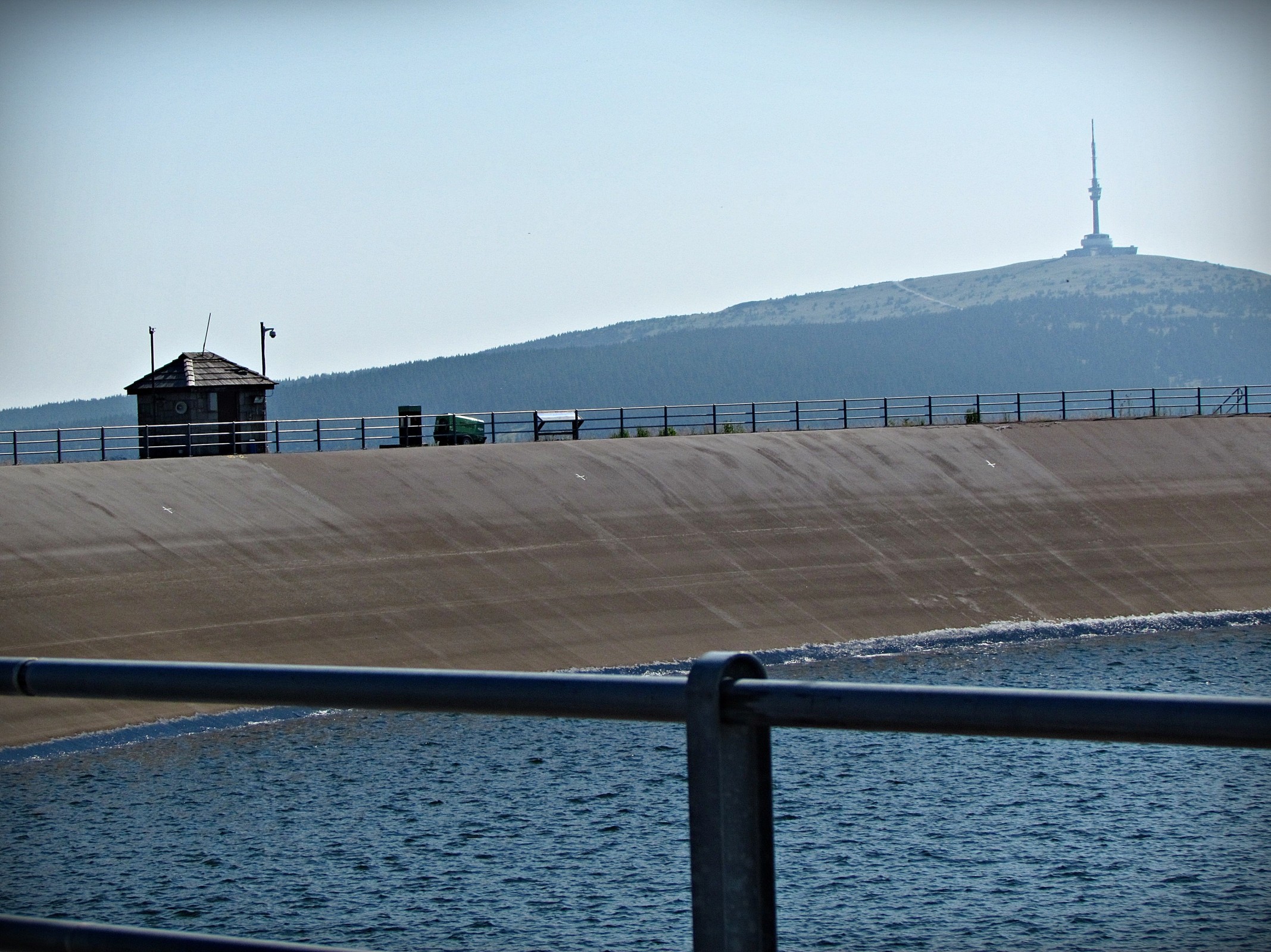 Minibus staví na parkovišti téměř pod vrcholem. Odtud nahoru na hráz po schodech a to už se před námi objeví úžasně modrá vodní nádrž - jesenické moře - vybudované jako jediná přehrada u nás na vrcholu hory ! I když nejsem zastáncem médiemi všelijak preferovaných "Divů", musím přiznat, že se mi tu i přes ty zápory velice líbí. Procházka po silničce okolo celé nádrže proti směru hodinových ručiček je dlouhá bezmála 2 km a je to snad i ta vůbec nejdelší vyhlídka v naší vlasti. Teď v abnormálním tropickém dni není samozřejmě výhled přes opar do dálek ten nejoptimálnější, ale jak pořád říká jeden můj valašský kamarád : "Mohlo to byt aj horší !!" Spokojeni se vracíme po schodech dolů, tam už znovu stojí ten mikrobus a prý ta naše jízdenka platí i pro zpáteční cestu. Jana celá šťastná nachází lístek, já ho ale ani nehledám, neboť hodlám jít nazpět pěšky. Loučím se s manželkou, která si na mne bude muset chvilku počkat : cesta zpět vede sice převážně z kopce, ale pořád je to skoro 4 km a to mne ještě čeká odbočka na vyhlídkové skály na Medvědí hoře !