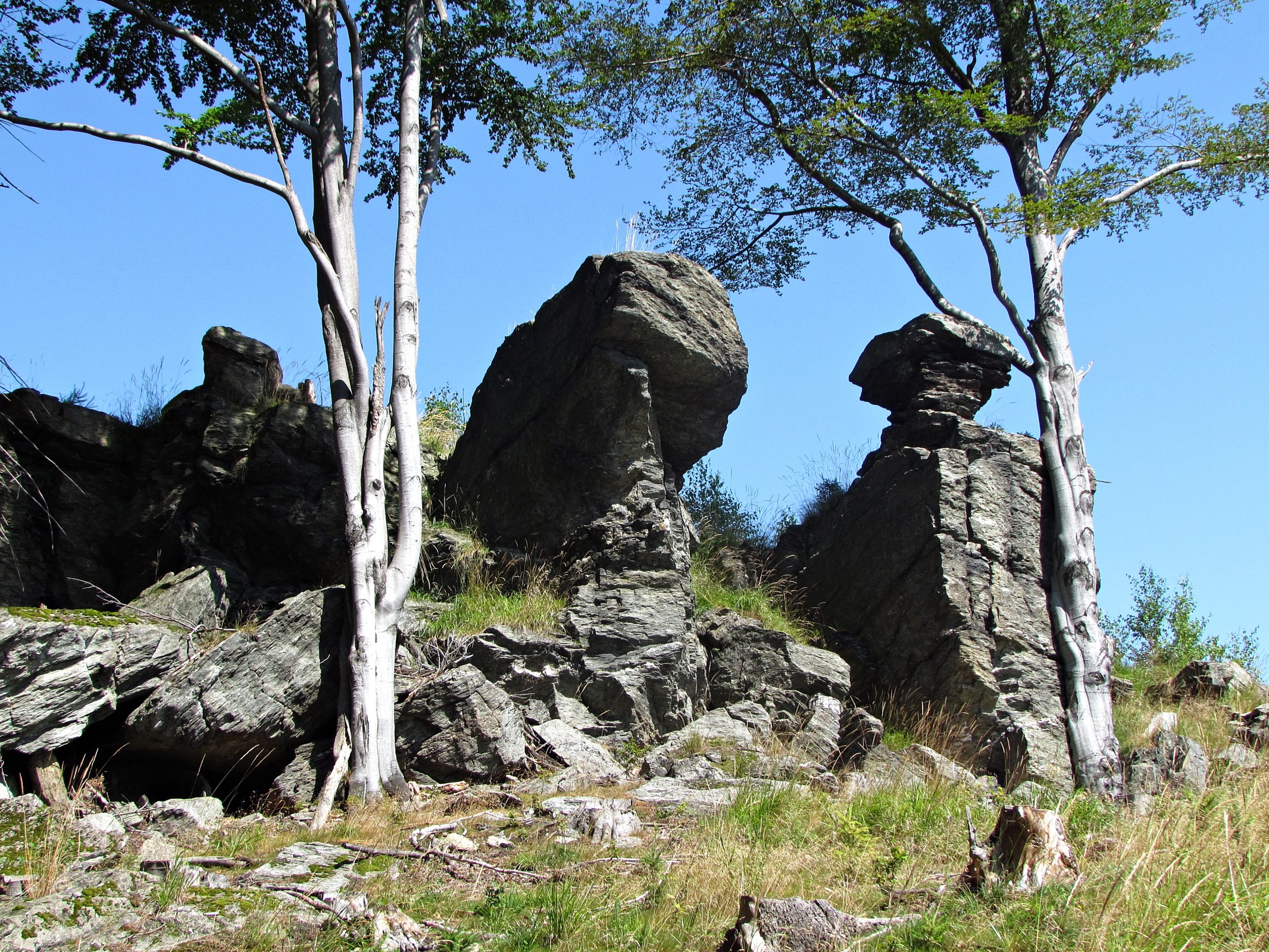 K vrcholu žádný chodník z lesní cesty neodbočuje a tak rovno hore horů, šak su přeca Valach. Úměrně mému nadšení a zatím chválabohu slušné fyzičce se sedlo rychle přibližuje. Už vidím první skalky, chvílemi si připadám jako bych měl křídla - (a to prosím znám Redbull jenom z té animované TV reklamy) - a najednou stojím na pasece. Tady bych rád vysvětlil, proč i za cenu "utrpení" zrovna toto místo : Skalnatý (Vížka) je hora, jejíž zalesněné temeno věnčí mohutné, až 20 m vysoké skalní bloky. Tyto velmi pevné a nelámavé rulové skalní útvary se staly díky malé vzdálenosti od civilizace a dobré dostupnosti oblíbeným cílem horolezců, na jejichž internetových stránkách jsem se o nich dozvěděl. Takovýchto krásných skal vzájemně sobě podobných je ale V Jeseníkách mnoho přemnoho, však mne sem také nejvíce ze všeho nalákala fotografie skalky na pasece, jejíž tvar připomíná bustu slavného francouzského vojevůdce Napoleona.
