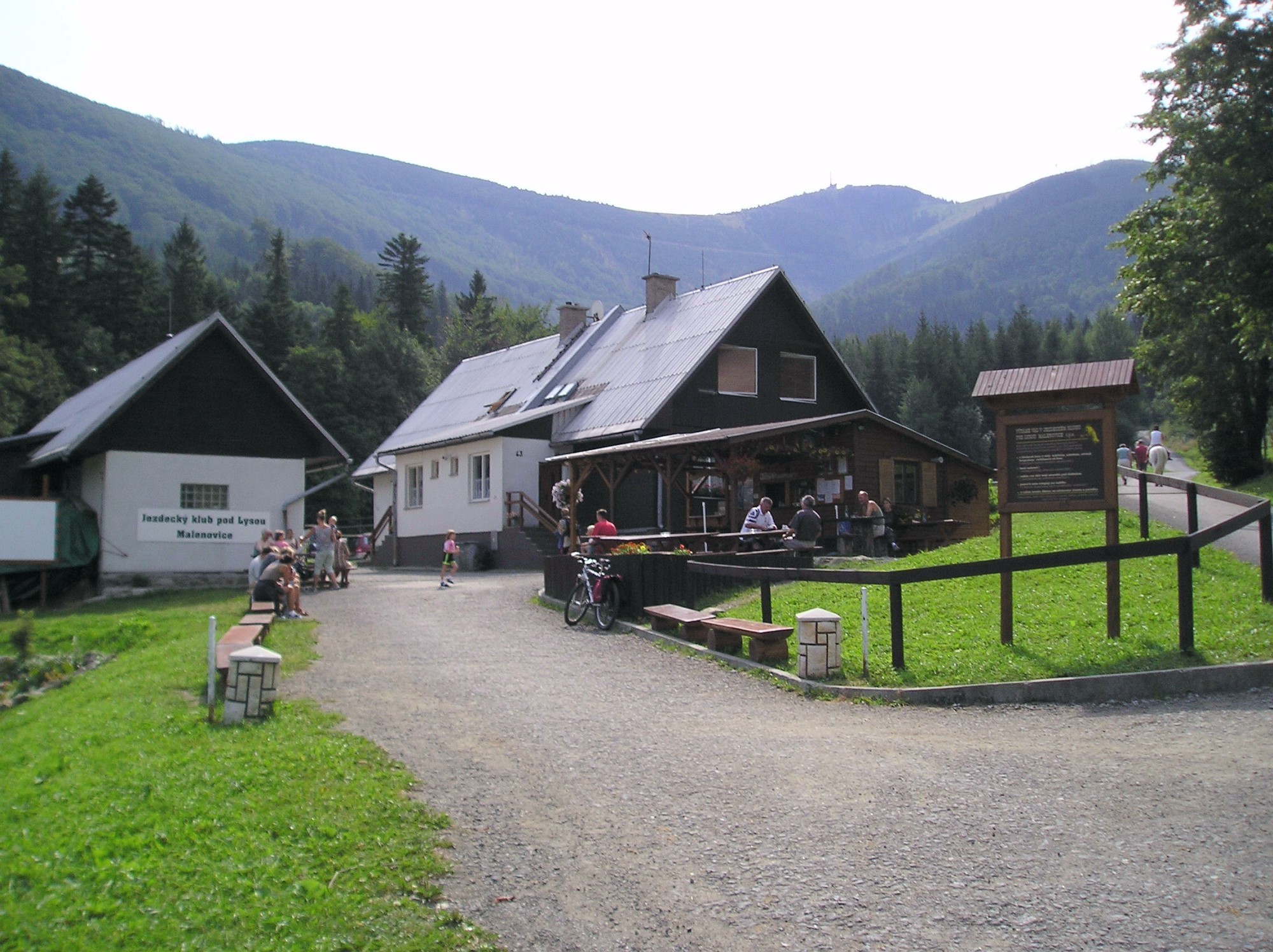 Vydáme se z parkoviště přes mostík do kopce na rozcestí Satina. Odbočíme vlevo a mírným stoupáním po 0,5 km dojdeme na jízdárnu (632 m). Cestou míjíme sjezdovku, chráněné louky a kocháme se výhledem Na Lysou horu. Na jízdárně je občerstvení a možnost povozit děti na koni.