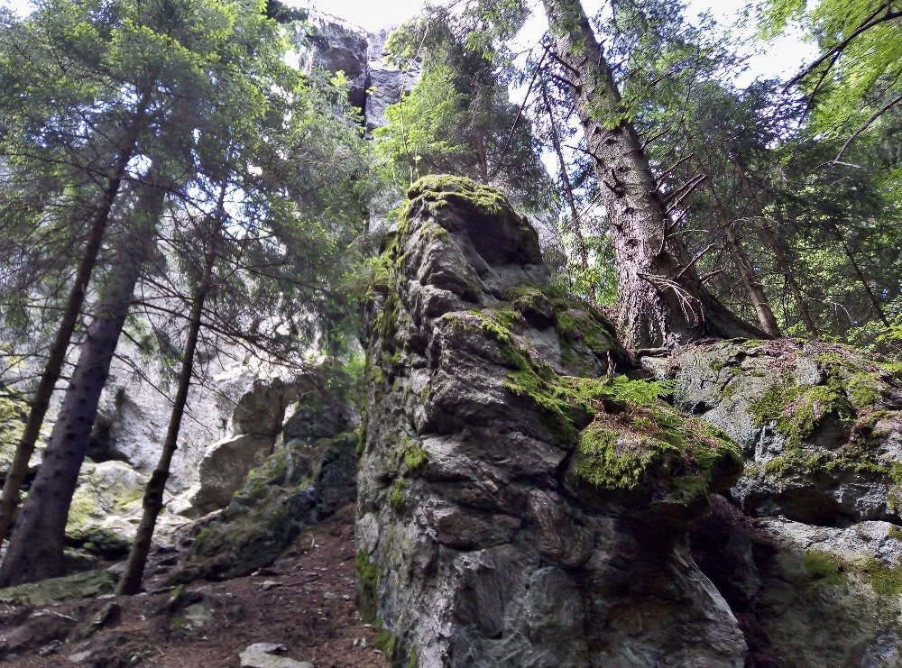 Podle mého domácího plánu jsme – po krátké konzultaci v místním informačním centru – vyrazili na modrý lázeňský okruh, který je dlouhý přibližně 4 km a jeho hlavním lákadlem je vrcholový Rolandův kámen (937 m, mapy ovšem většinou uvádí jen 910 m). Tento pozoruhodný a monumentální skalní útvar měl být i vrcholem dne ... a také byl. Nechyběla slibovaná zvrásněná rula, výška téměř 40 m, vrcholový dřevěný kříž ani množství horolezeckých tras. Jen ty výhledy už nejsou jako kdysi, protože okolní stromy přece jen „trošku“ povyrostly. Ale Praděd stále vidět je.