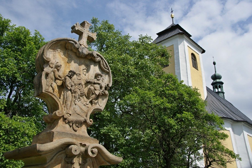 Za prohlídku – pokud se tato příležitost naskytne – rozhodně stojí také interiér kostela s hranolovou západní věží. Ten je jednolodní, až neobvykle světlý a završený valenou klenbou. Zaujmou zde zejména mramorový oltář, kopie obrazu z římské baziliky Panny Marie Sněžné, sochy sv. Jáchyma a sv. Anny nebo varhany z roku 1762, které jsou údajně posledním funkčním nástrojem mistra Schwarze z Města Libavá. Naším cílem ale je kamenná křížová cesta, která od tohoto kostela vychází a která bývá označována za sochařské dílo výjimečné výtvarné úrovně, navíc zcela ojedinělého kompozičního pojetí. Na vrcholu Křížového vrchu (Kreutzberg) se nachází sousoší Ukřižování (Kalvárie coby 12. zastavení), které je vysoké přibližně 7 m a sochy Krista, Máří Magdalény, Panny Marie a sv. Jana Evangelisty jsou zde vyvedeny v životní velikosti.