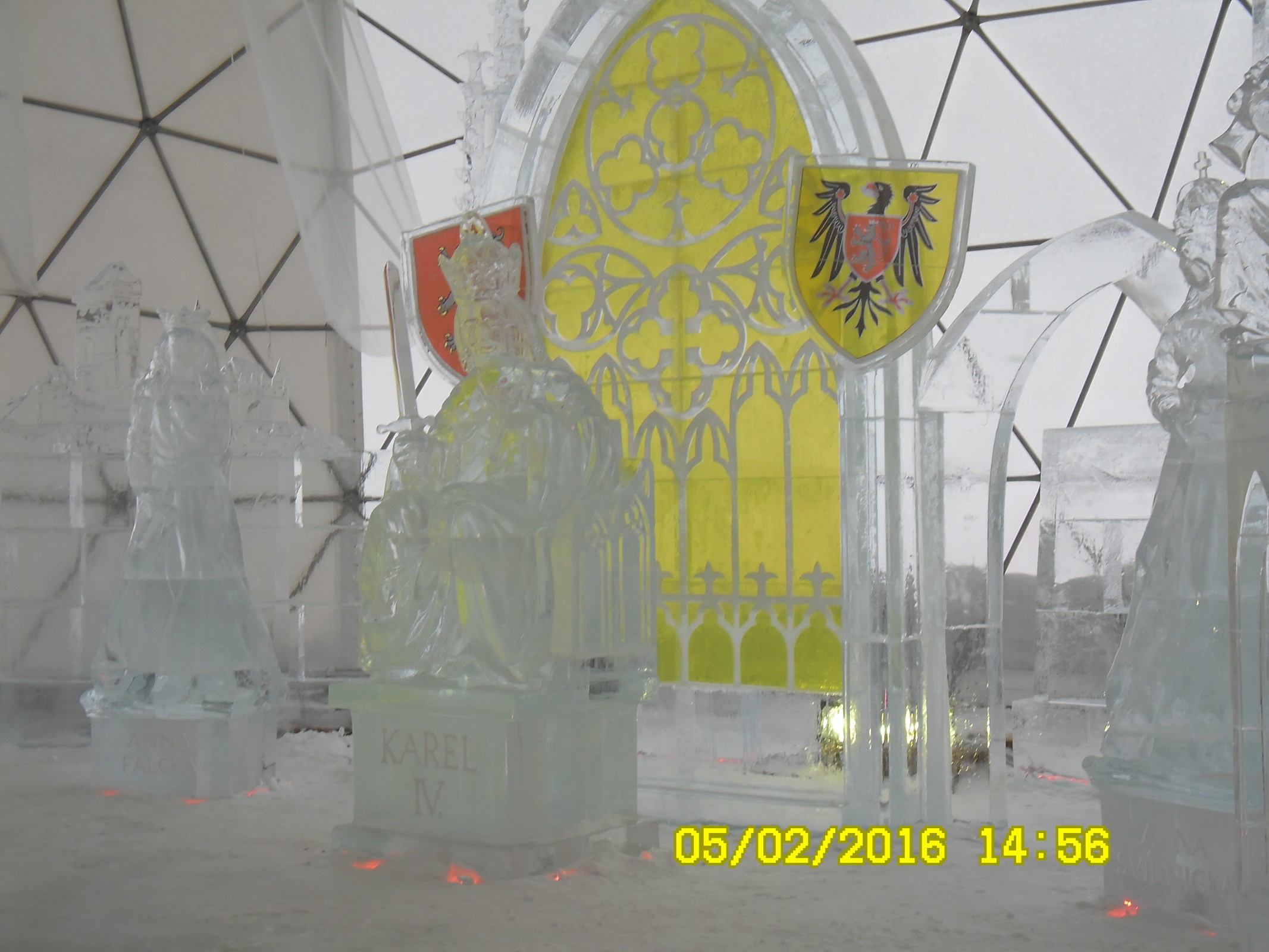 Cílem byla výstava ledových soch s tématikou Karla IV. k 700. výročí. Skibus nás dovezl zdarma do lyžařského střediska Svatý Petr. Za "super zvýhodněnou cenu" jsme se měli dostat šestisedačkovou vyhřívanou lanovkou k horní stanici, kde se výstava konala. Pravda, člověk si musel vystát frontu mezi lyžařemi a nebylo to moc příjemné.