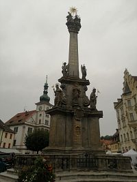 Sloup Nejsvětější Trojice byl vztyčen na náměstí v roce 1719. Celá skulptura má trojúhelníkový půdorys, na trojúhelníkovém sloupu je sousoší Nejsvětější Trojice, podstavec je zdoben sochami Světců, na jeho bocích jsou texty modliteb s chronogramem data vzniku. Předpokládá se, že sloup byl zhotoven podle návrhu Jana Karla Stüpla.