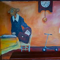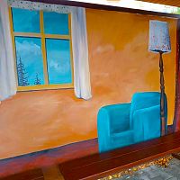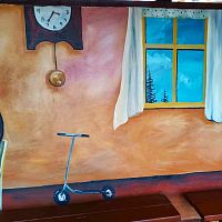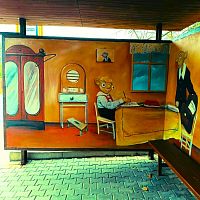 Jedeme si prohlédnout výmalbu autobusové zastávky od autora Daliho Figelyho. Malba je zde k vidění od října 2025.