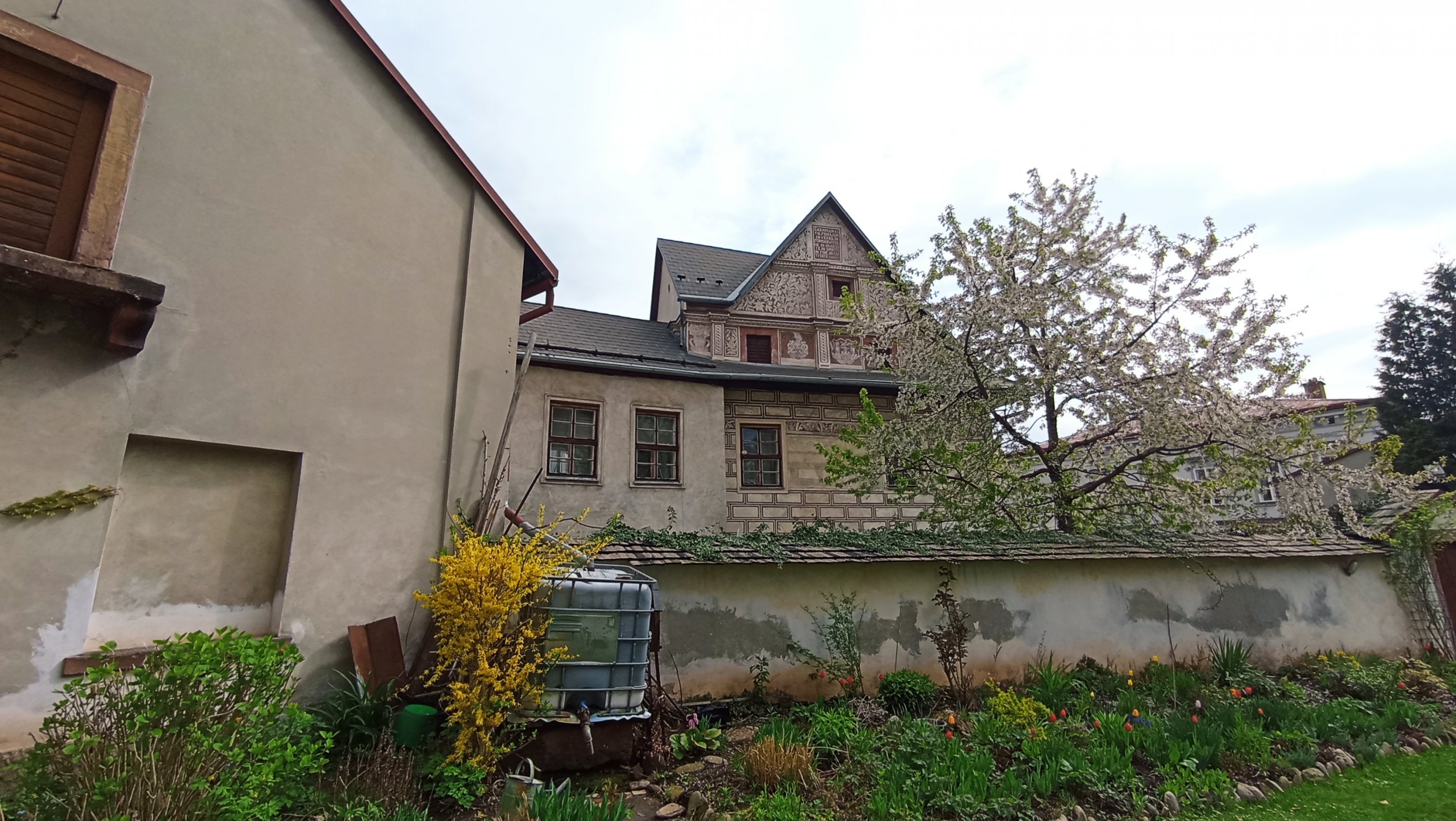 Budova vlevo je zchátralá papírna, původně renesanční zámek
