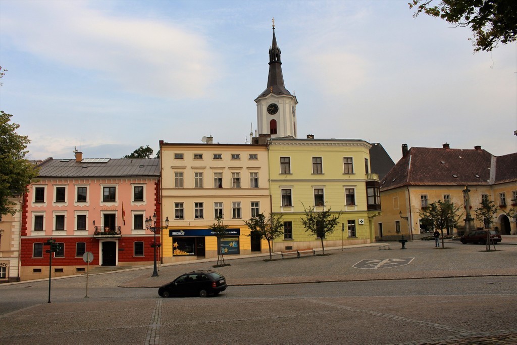 První písemnou zmínku o městě lze najít v roce 1367, ale tehdy se jednalo o malou osadu obklopenou ze všech stran hlubokými lesy. K povýšení na město údajně došlo v roce 1568, ale mohlo to být i o několik let dříve. Že je to město hezké, ve kterém se nacházejí i zajímavé památky bylo zřejmě na počátku vyhlášení městské památkové zóny v roce 1990. Tolik krátce z jeho minulosti. Do začátku srazu mně zbývá celé dopoledne a já se rozhoduji pro procházku městem a pak se uvidí, co dál. Začínám na náměstí, některé domy mají renesanční původ, ale časem se většinou změnily. Na severní straně náměstí je stará klasicistní radnice z let 1795 až 1796. Dnes v ní sídlí muzeum a místní informační centrum. V rohu náměstí je dům, který stojí na místě Valdštejnského zámku z let 1577 – 1585. Mezi domy na západní straně stojí radnice současná. Zajímavá je jižní strana s podloubím a východní s hotelem Bílá Labuť. V rohu náměstí je kamenný kříž z 18. století. Uprostřed mezi stromy je empírová kašna se sochou přadleny. Zbývají dvě dřevěné věžičky, v té na jižní straně je možné zjistit údaje o počasí. Náměstí je dlážděné a lampy veřejného osvětlení se skutečně povedly.
