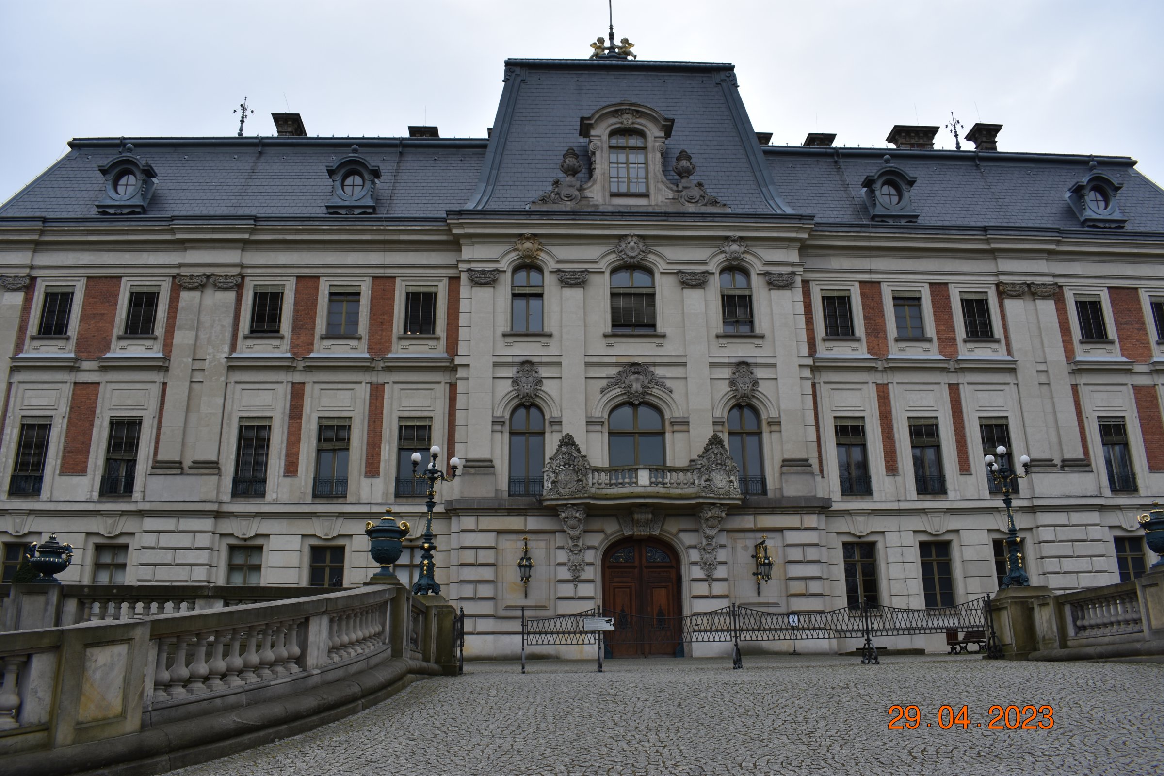web První naší návštěvou bude místní zámek obklopený rozsáhlým anglickým 150 ha parkem. Prohlídka je volná, k dispozici máme audioprůvodce v češtině. Zámek nebyl zasažen, poničen druhou světovou válkou, tudíž zůstal zachován původní nábytek, vybavení, tapety a patří tím k těm nejcennějším v Polsku. A vzhledem, že zde pobýval, měl své komnaty i poslední německý císař Vilém II. Pruský, je se nač dívat, včetně císařova lože.