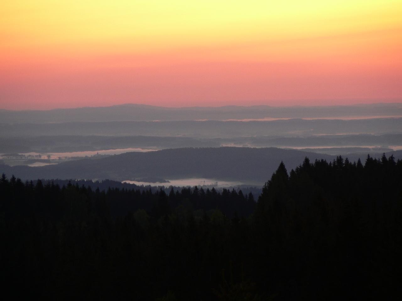 Došli jsme včas a do pěti minut by mělo začít velkolepé představení, které se sice opakuje každý den, ale vždy je jedinečné a jiné. Na obloze se rozbíhá hra barev a stínů. Velkolepá barevná paleta se rozložila po celé obloze a na jeviště pomalu vstupuje hlavní postava. Srpek sluníčka v rudém plášti se objevuje na obzoru a pozvolna se zvětšuje. První polibek paprsků patří vládci hor, Velkému Javoru ( 1456 m.n.m.) a postupně se laská s okolními vrcholy. Dočkává se i Hadí vrch a nedaleký Vysoký hřbet (1078 m.n.m.). Paprsky pronikají po svazích do údolí. Jsou okamžiky, kdy chybí slova, ale někde uvnitř cítíte naplnění naší krásné hymny. A to je ta krásná země......