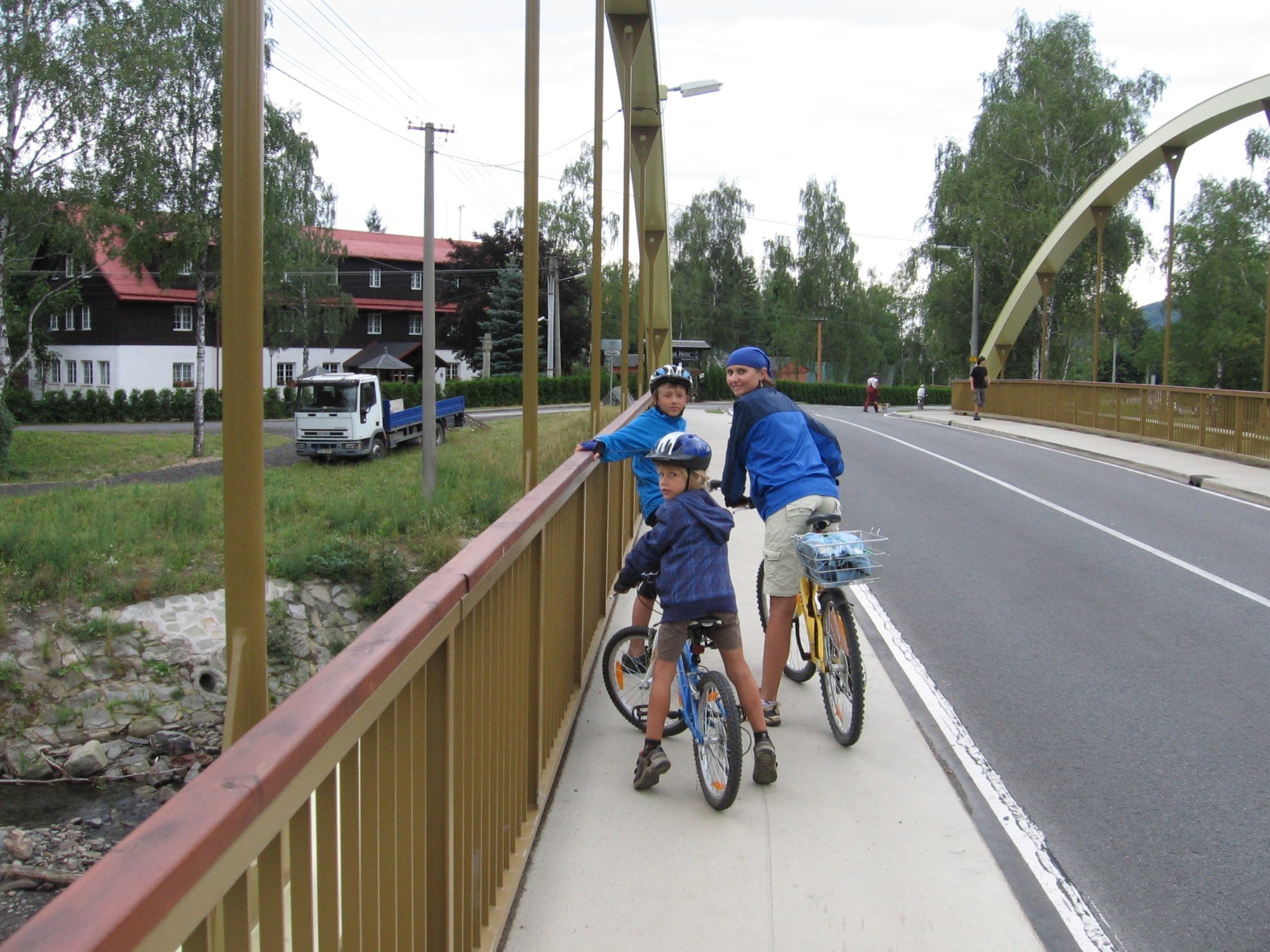 Do Morávky jsme přijeli autem, které necháváme na pakovišti u mostu přes řeku. Tady se hned naše cesty rozdělí. Malý cyklista s doprovodem se vydává po cyklostezce okolo Morávky a zdatnější část rodiny jede na opačnou stranu do Pražma a dále pak přes Krásnou na Visalaje.