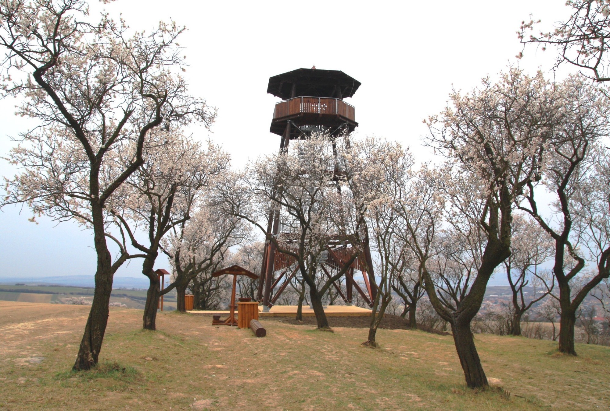 Za novým rozhlednovým místem - Mandloňovou rozhlednou, která byla v minulém týdnu dokončena a bude slavnostně otevřena pro veřejnost v sobotu 31. března. Je vysoká 17 m a je z ní kruhový rozhled po celém Hustopečsku. Nachází se na okraji mandloňového sadu, který právě nyní rozkvétá. Svými bělostnými košatými korunami je nepřehlédnutelný v okolní dosud spící krajině. Mandloně jsou prvními posly jara a jsou prvními stromy, které zde na jihu Moravy rozkvétají.