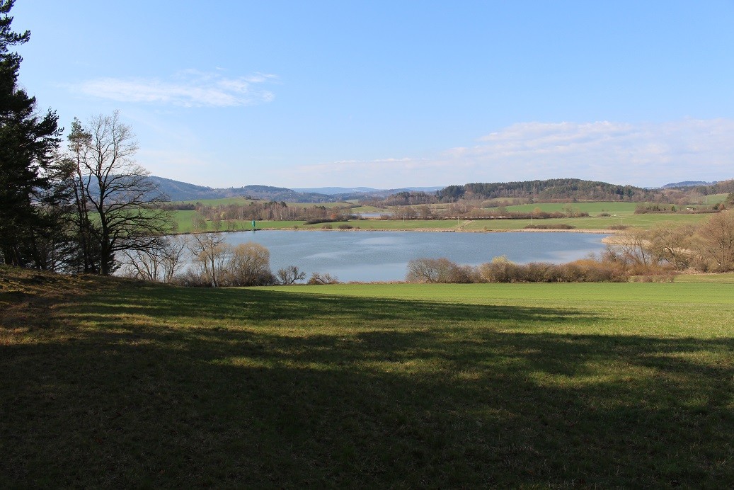 Stojíme na hrázi Dalováku, který nás vítá klidnou hladinou. Jeho hráz je osázena stromy a výhledy do okolí jsou jedinečné. Na západě je vidět Zbyná ( 615 m.n.m.) na opačné straně Cuková ) 592 m.n.m.). Svatobor na jihu trochu povyrostl a návrší nad severním břehem láká svým borovým kloboukem. Míjíme dalovickou samotu a začínáme stoupat. Malý rybníček Buděšínku obcházíme po východní straně. Na hrázi je několik nádherných růžic bodláků, které čekají na probuzení. Na mezi při cestě kvetou křivatce luční ( Gagea pratensis), které zkoumá několik včel. Jsme na vrcholu návrší, pod námi se leskne hladina Dalováku a o něco dál k JZ Zbynické rybníky. Na JV máme část Budětické vrchoviny, jih vyplňuje Svatobor a v dálce se modrají hory Šumavy. Na severu je ves Čejkovy a její okolí. Místo přímo zve ke krátkému zastavení. Zřejmě si to myslí i moje psí společnice Endy.
