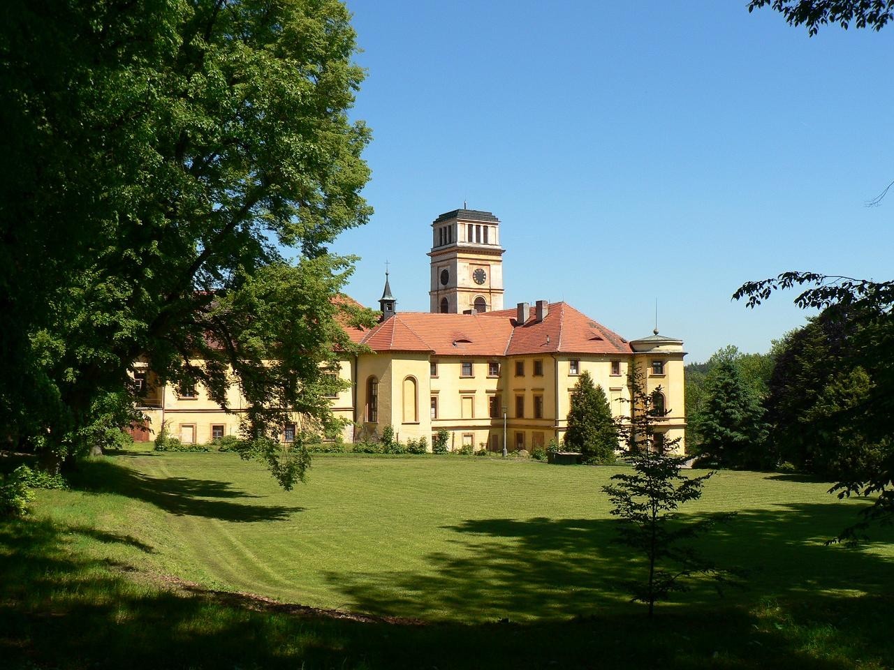 Z náměstíčka procházíme poměrně hezkým anglickým parkem k zámku. Je zde několik skutečně nádherných a starých stromů. Krásné červenolisté buky, lípy a další listnáče nejsou jen tak někde. Zámek spatřil světlo světa v 17. století a nechali jej postavit Švihovští z Rýzmberka. Byl několikrát upravován v 17. a 18. století a výrazně přestavěn ve druhé třetině 19. století ve stylu romantismu. Celý objekt lze obejít a prohlédnout ze všech stran. Nad zámkem je návrší, pravděpodobně zde byly upraveny haldy hlušiny. Je zde Kostel sv. Kateřiny. Byl postaven v letech 1721 až 23 v barokním slohu. Nechal jej postavit Norbert z Pöttingu. V roce 1846 byla zvýšena věž. Ta v roce 1919 vyhořela a byla znovu obnovena.. Mimořádné jsou sochy a křížová cesta v okolí kostela z první poloviny 18. století. Vlastně galerie pod širým nebem. Za kostelem je kříž z roku 1856 a socha světce. Kolem kostela stojí dalších šest soch světců. V malém parčíku je křížová cesta a vše končí nádhernými sochami Madony, sv. Václava a sv. Víta. Budova nové školy nikterak tento soubor neruší a vhodně zaplňuje jižní stranu návrší. Žákem nedaleké staré školy u kostela byl i Karel Klostermann. Parkem se vracíme zpět do středu města. Pozornost si zaslouží i několik hospodářských budov u zámku. Na komíně jedné z nich žije čapí rodinka. Bohužel městem prochází silnice z Klatov do Strakonic a tak zde mají rušno. Na náměstí objevujeme další hezkou sochu sv. Jana Nepomuckého a protože je čas k občerstvení, hledáme kam zajít.