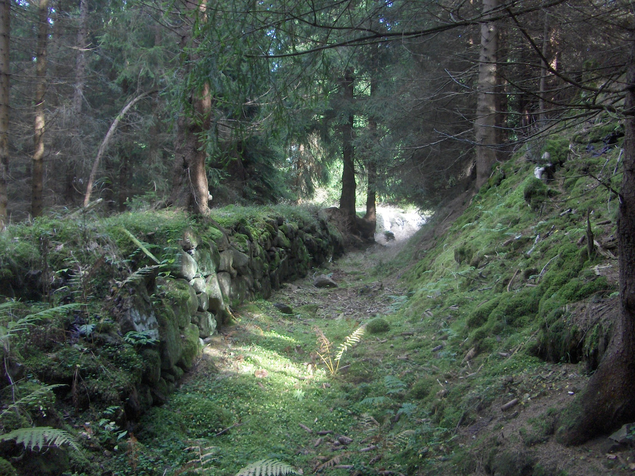 První úsek jsem prošel již několikrát a je popsán na Turistika/výlety/ Flájský plavební kanál. Tak pokračuji od odbočky zelené turistické značky u Horní Vsi. Od tohoto odbočení stezka pokračuje po zasypaném tělese kanálu na silnici vedoucí z Českého Jiřetína do Horní Vsi. V současné době je tento úsek rozježděný auty po těžbě dřeva. V místech dnešní silnice se kanál prudce stáčel do protější stráně. Stezka pokračuje kousek níž ze silnice nenápadnou cestou mezi chatami a mírně stoupá lesem ke zbytkům kanálu. Plavební kanál pak obtáčel vrch a ve svahu kopíroval pod ním tekoucí Bystrý potok. Stezka pokračuje po loukách, po zasypaném tělese kanálu a je značena dřevěnými sloupky. Asi po jednom kilometru vchází opět do lesa, kde je kanál dosti zachovalý.