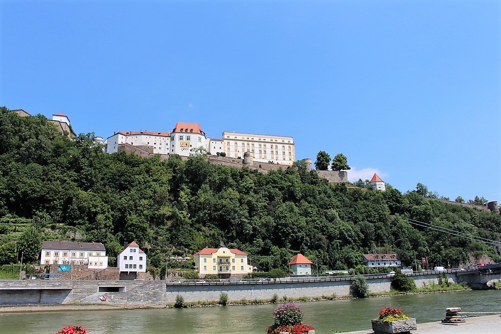Od nádraží jdeme po Bahnhofstrasse na rušný Ludwigsplatz, kde jsme asi po pěti minutách. Dnes jsou ve městě nějaké církevní slavnosti a je přelidněno. Od náměstí začíná staré město a vyhýbáme se davům projitím starými uličkami k Dunaji. Po nábřeží jdeme až k přístavu a ke staré Radnici. Z nábřeží je moc hezký pohled jak na řeku tak i samotný hrad. Nedaleko Radnice přecházíme most a za ním začíná stezka se schody k hradu. Z několika míst je hezký pohled na město a z větší výšky i pohled na soutok Dunaje s Innem a Ilzem. První hradní brána a hradby jsou za námi a pokračujeme procházením hodně rozsáhlého hradu. Přístupnou částí je hradní muzeum zaměřené na region Pasovska. Výhodou jsou popisky v češtině. Záměr navštívit hradní restauraci pro její úplné obsazení musíme vyloučit. Pivko si dáme až ve městě. Zbývá projít hradní vyhlídky. Na tu nejvyšší nás vyváží výtah. Pohled na řeky a město je impozantní. Další vyhlídka je v parku nad hradem. Ta je zcela obsazena a tak po nějaké době se konečně dostáváme k zábradlí. Tmavá voda Dunaje a do bílé zabarvený mohutnější Inn jsou jako z pohádky.
