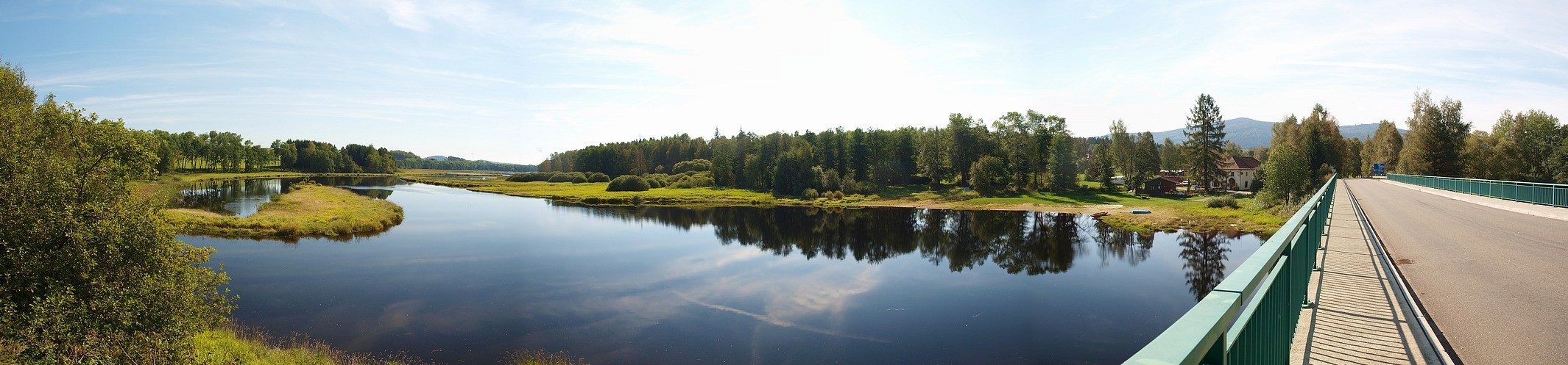 Plešné jezero zabrané z jeho hráze. Zelený bod ukazuje vyhlídku s kamenným obeliskem A. Stiftera autor: Zdenek1945