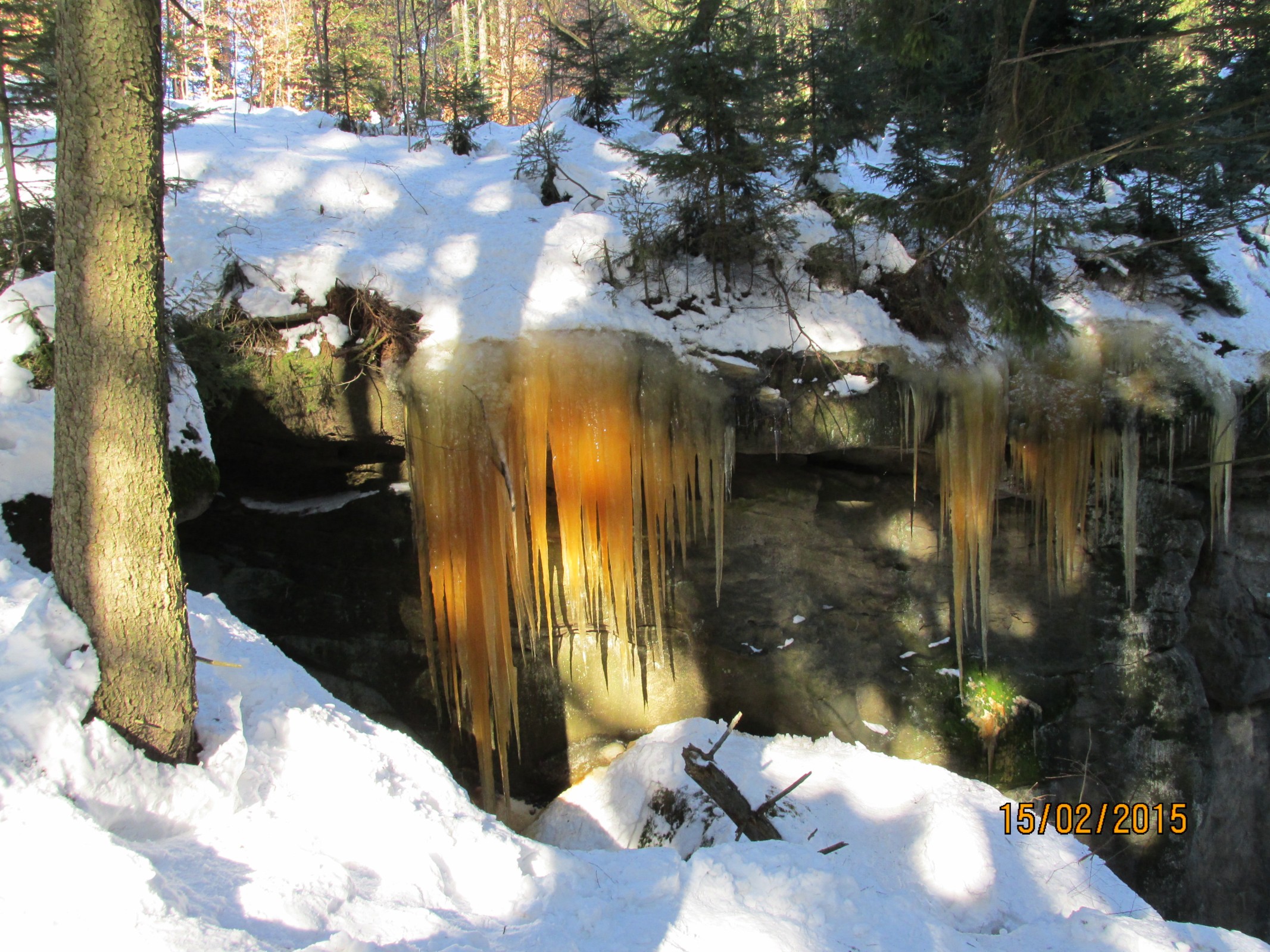 Vyrážíme nejprve po silnici kolem infocentra a pak už zasněženými pláněmi do přírody. Hluboko v lesích na skále jsou skryté ledopády, tzv. sněžné řasy. Jejich zbarvení způsobuje řasa žijící ve sněhu a ledu.