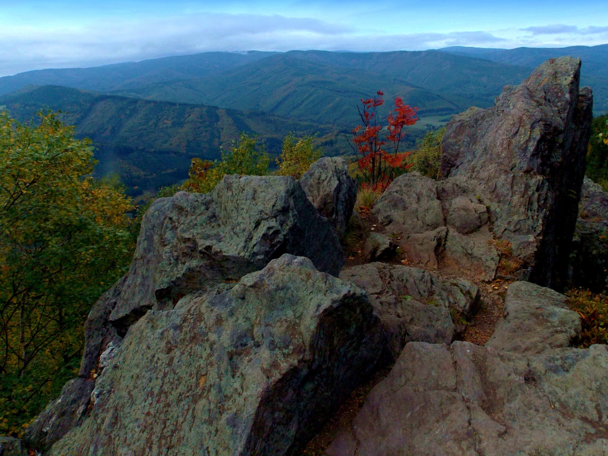 Takže jdeme kousek po žluté, lázeňským okruhem stoupáme zpevněnou lesní cestou k Arnoštovu krmelci. Když se ohlédneme - v mracích nejsou výhledy nic moc. Potkáváme spokojeného houbaře - nese si plný košík. Stoupání ustává a my po modré obcházíme 1,5 km údolí vrstevnicí k rozcestníku. Zelená značka nás vede dál drastickým stoupáním k Medvědímu kameni do výšky 907 metrů. Odtud máme výhledy na Jeseníky a Rychlebské hory. Medvědí kámen je soustava rulových útesů s množstvím skalek v okolí.