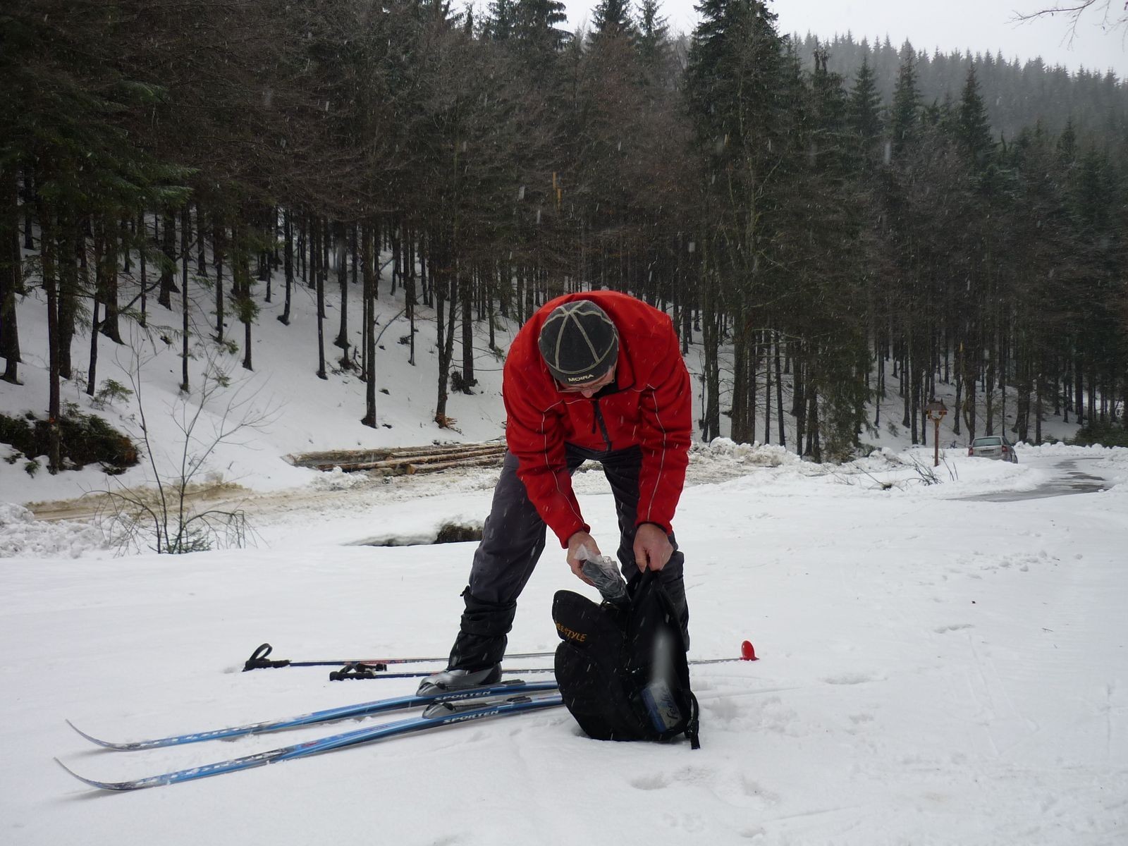 Sobota 20. února. Jedeme na běžky, naším cílem jsou Velké Karlovice - Léskové, ale ve Zlíně taje a prší a tak naše skupinka vypadá na autobusovém nádraží poněkud nepatřičně. Během cesty autobusem se situace lepší jenom velice pomalu, ale v Karlovicích už je sněhu dost, neprší, drobně sněží. Ve Velkých Karlovicích jsou každou zimu upravené běžkařské stopy, na kterých se mohou projíždět i úplní začátečníci. My vycházíme od restaurace Pod pralesem směrem k Pralesu Razula - první část bez běžek, na silnici není sníh, ale u rozcestníku už běžky nasazujeme a a jedeme směrem k hotelu Horal, odsud na rozcestí Babská a dál k hotelu Galík. A okruh zakončíme v restauraci Pod pralesem, kde si dáme oběd.