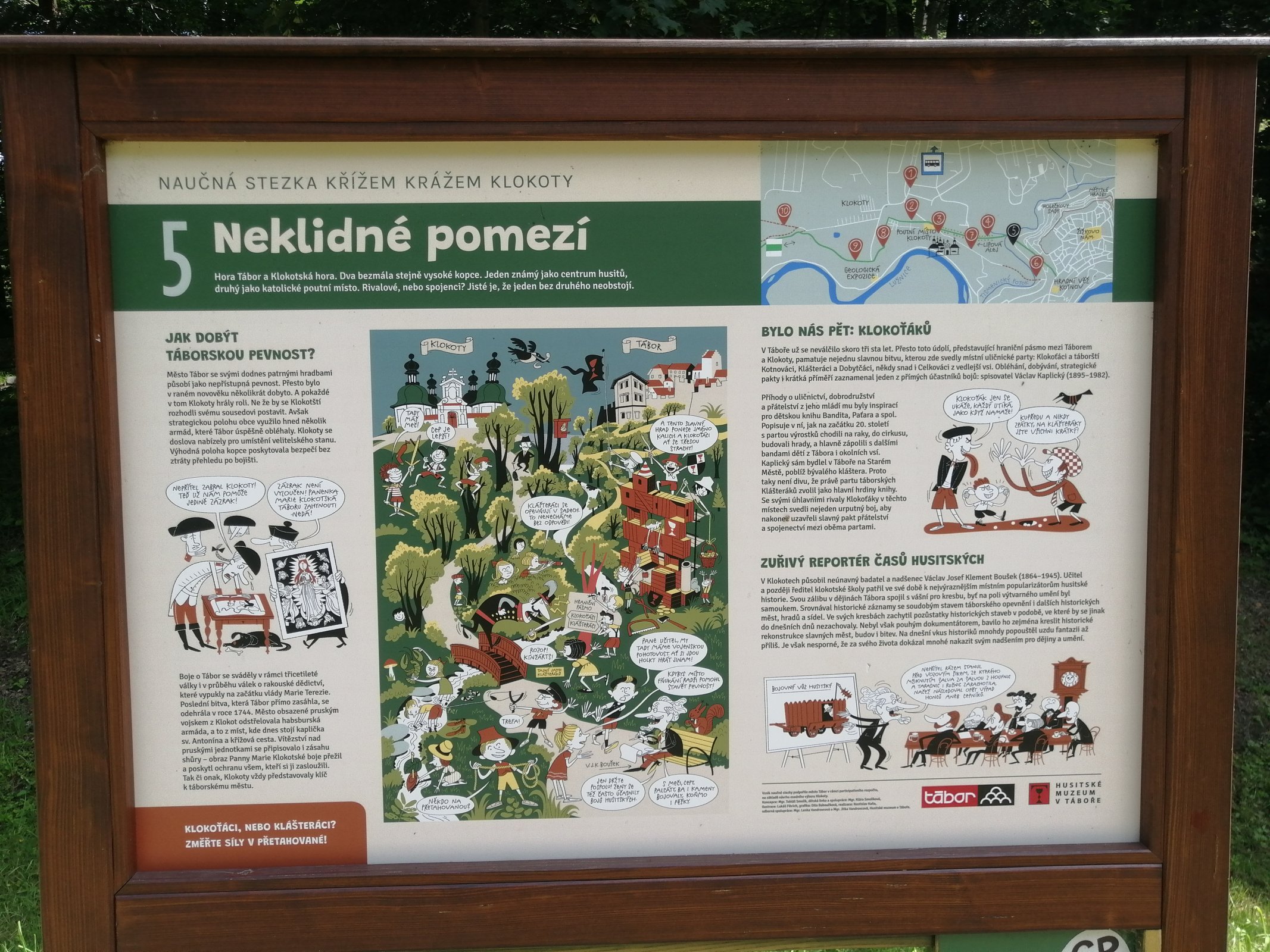 Po cestě jsme šli také kousek naučnou stezkou Křížem krážem Klokoty a našli dokonce i houby. Po vyfunění kopce nahoru Vás ovšem čeká nádherný pohled na celý areál, nachází se zde Římskokatolická farnost Tábor-Klokoty, Klášter Benediktinů a kostel Nanebevzetí Panny Marie v areálu je i nádherný vyřezávaný dřevěný betlém.