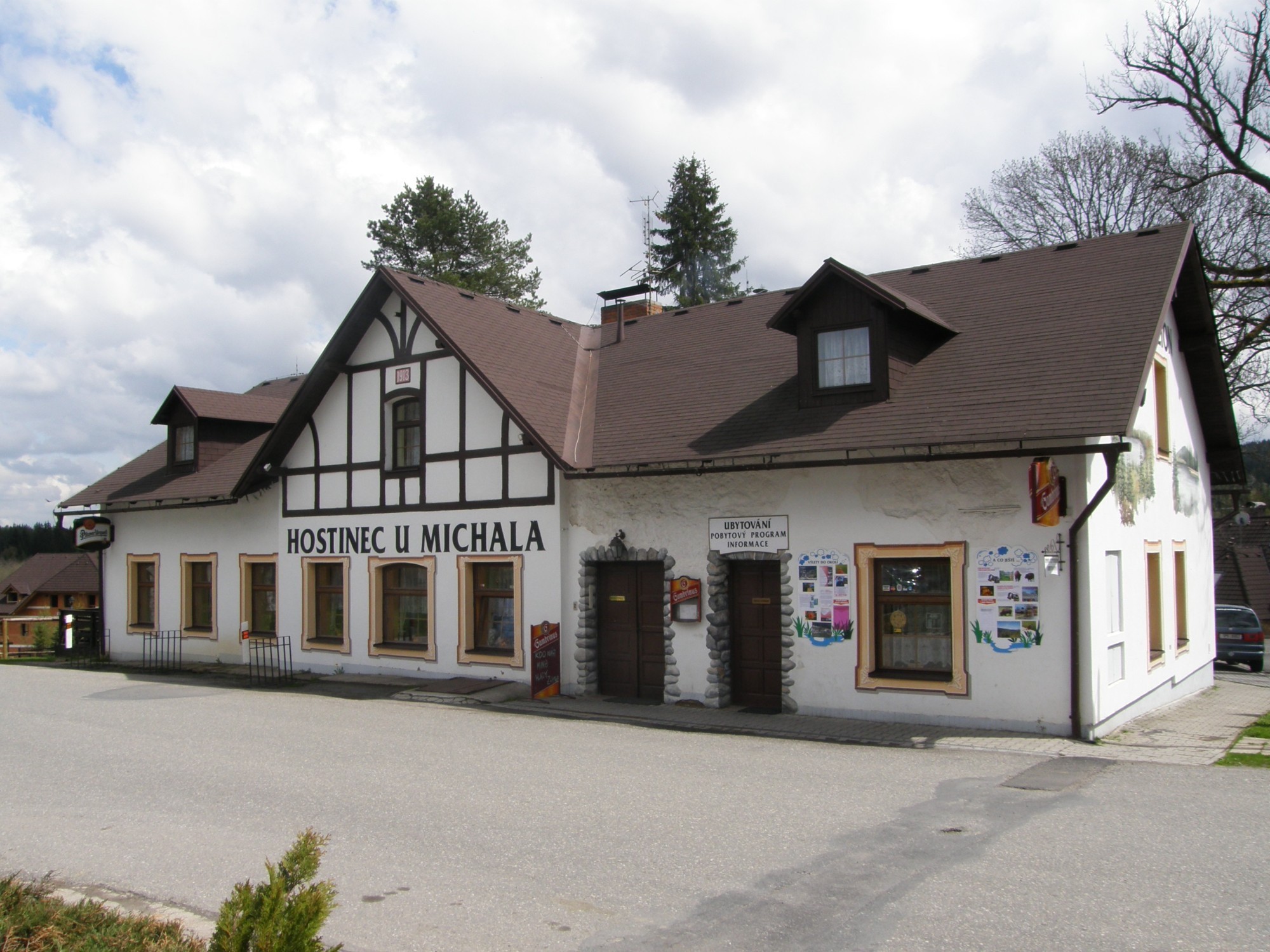 Jídlo jsme měli své, nicméně po návratu z Přášilského jezera jsme se zastavili na výborné večeři v restauraci "U MIchala" přímo ve středu Prášil. Sice nás zklamalo, že nebyla uvařena hříbková polévka se smetanou, nicméně "Opravdovej" i "Uzenářskej" řízek, nás po výletu dokonale zasytili. Cena cca 100,- Kč za každou "minutku" nám přišla odpovídající, s ohledem na množství i kvalitu. Snad jen ten americký akční film, který na nás hulákal z televizní obrazovky nad našimi hlavami, nemusel být. Pokud dorazíte do Prášil během dne, určitě doporučujeme i zdejší cukrárnu a bezprostředně sousedící a pro turisty zajímavý obchůdek s potravinami.