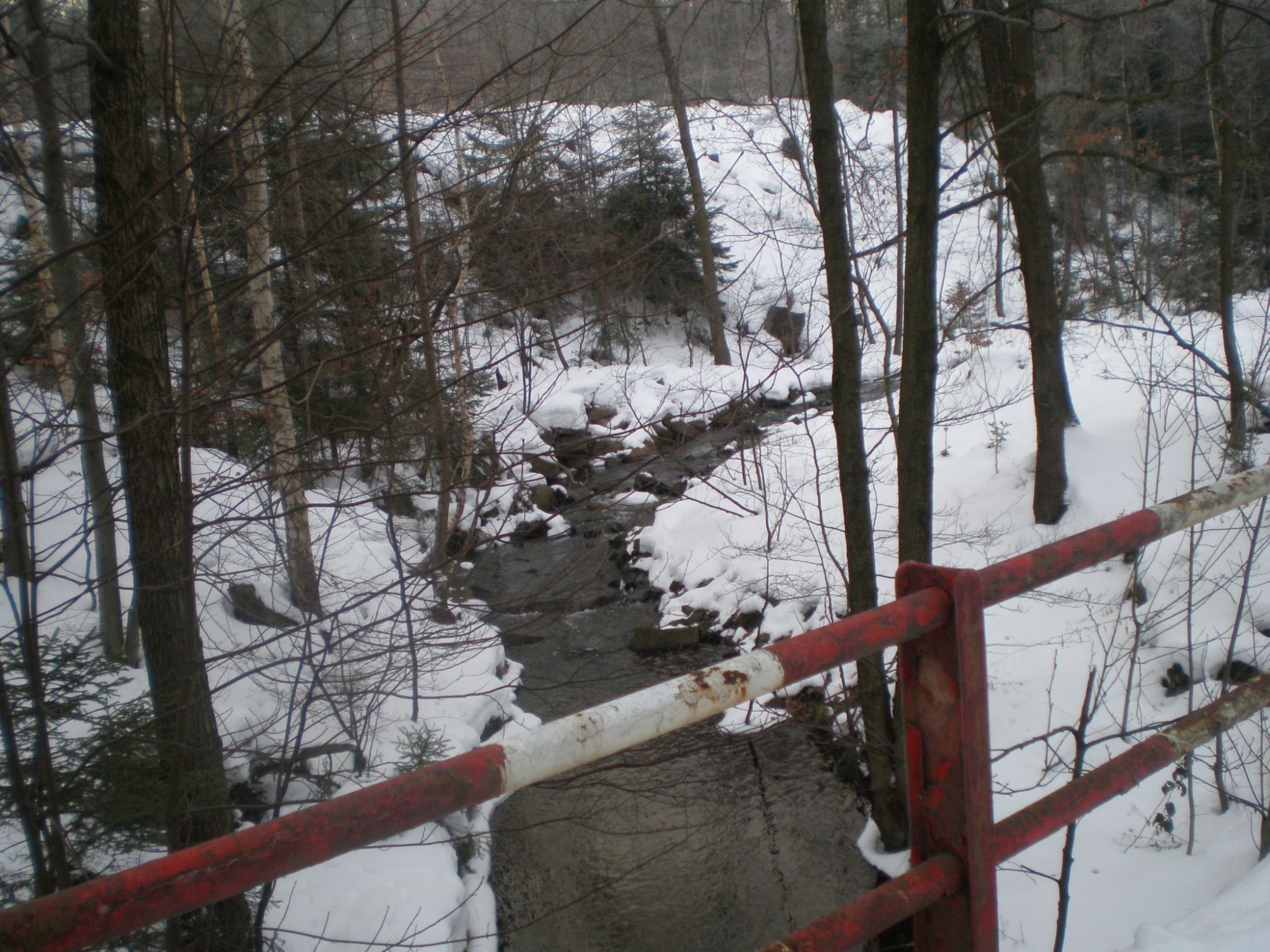 V sedle definitivně zmizel i pozůstatek lyžařské stopy a nyní nás čeká prudký sešup, bohužel stále v hlubokém sněhu, kterým jsme nuceni se brodit. Nedá se bohužel ani často fotit – v aparátu zamrzá už slabá baterie. Po 900m prudkého klesání dorážíme na rozcestí u studánky pod Brdou (670m), kde konečně narážíme na stopu těžké lesní techniky. Nedaleko odtud jsme si také konečně opekli ty buřty a osvěžili se. Nyní nás už čekají jen pouhé 3 km stálého, ale už pohodlného, klesání do Obecnice (520m). Tady, v hospodě, místními nazývané „U Stalina“, jsme příjemně vyčkali příjezdu autobusu do Příbrami a náš vánoční výšlap tak skončil.