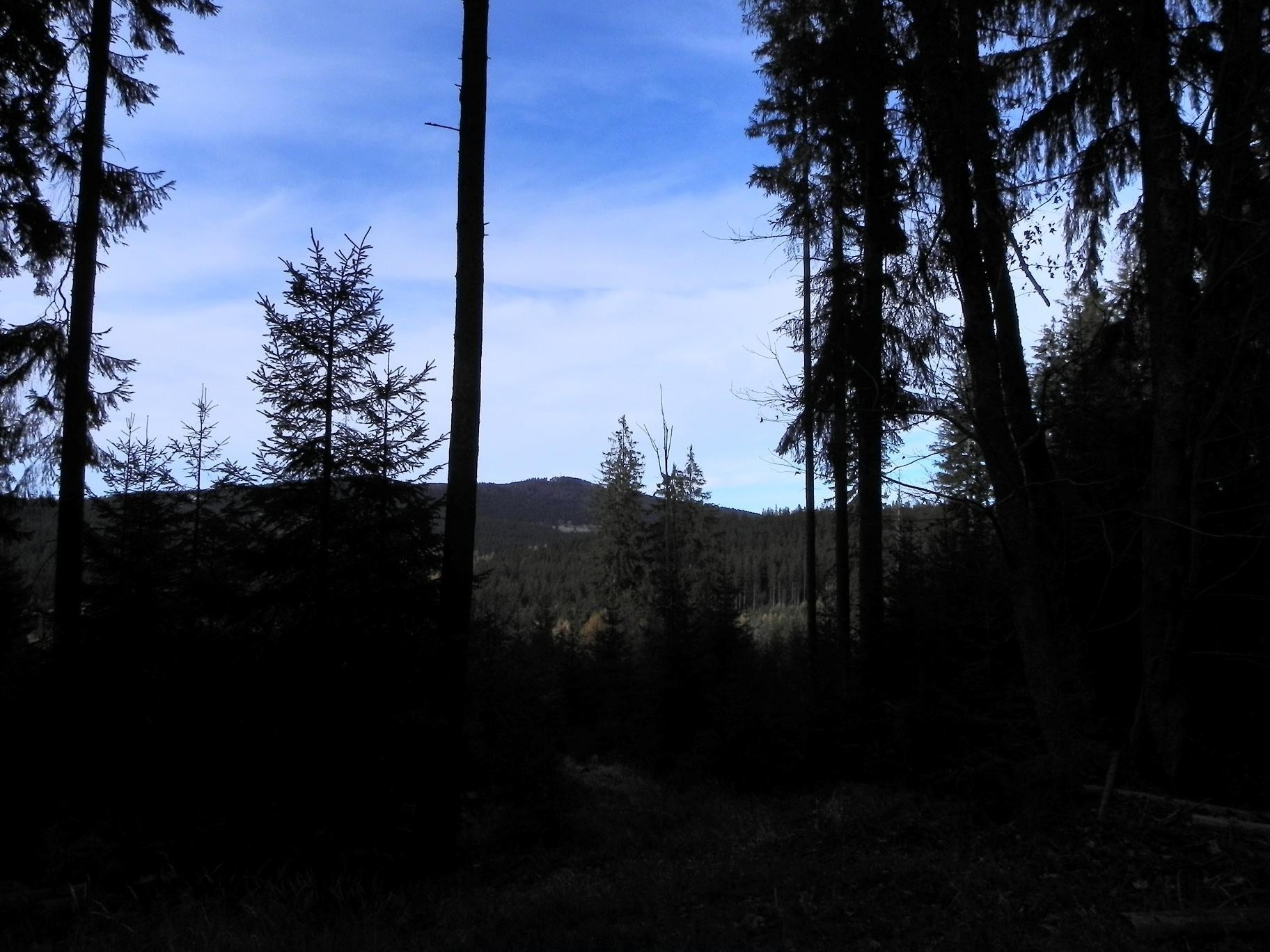 Průhled lesem na Pancíř z cesty do Žel. Rudy