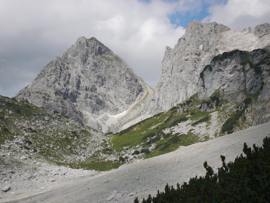 Na stezce Pernerweg, vzadu horní stanice lanovky