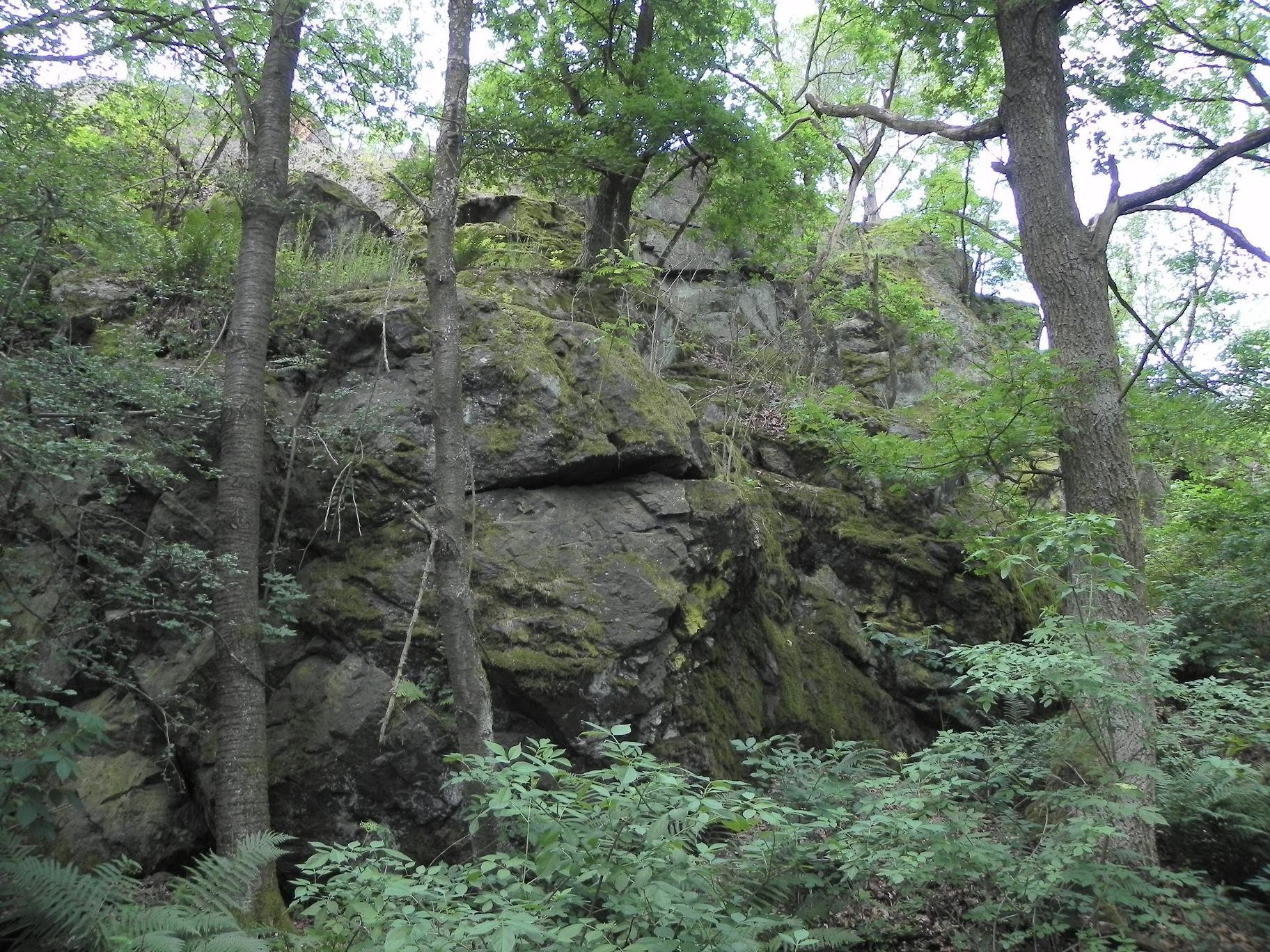 Před námi je nepropustný val křoví, kopřiv a dalších odolných rostlin. Tam někde uvnitř má být naše skála. Obcházíme kolem křoví dostatečně varováni trnkovými trny a přes metr vysokými kopřivami. Vypadá to, že se ke skále jen tak nedostaneme. Když to již vypadá na ústup, je pod mostem z kopřiv úzká, dosti vyšlapaná pěšinka, zřejmě tudy procházejí místní obyvatelé ze zvířecí říše. Přesto platíme vstupné v podobě popálení kopřivám a za jejich pásem se ocitáme v jiném světě. Z polorozpadlého krmelce je vidět, že sem lidská noha již někdy vkročila. Skála před námi vystoupila znenadání. Výšku odhadujeme kolem 8 m a tak je naděje, že bude výš než okolní stromy. Přicházíme do místa, kde dříve byl malý lom a o kousek dál je několik kamenných ploten, po kterých se dá vystoupit na hřeben. Z vrcholu skály se nám nabízí opět pohled na Brdy a k jihu vidíme stromy porostlý pahorek Vlčtejna. Dalšímu rozhledu brání stromy.
