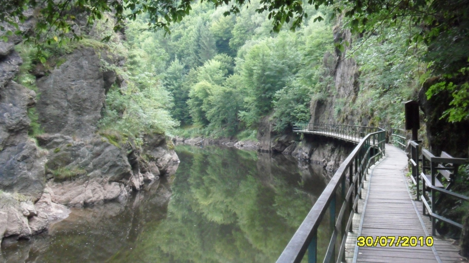 ÚDOLÍ JIZERY,GALARIE(Český Ráj)-Kousek za městem Semily mezi Bítouchovem a Podspálovem se nachází pozoruhodné a romantické údolí, které zde v délce asi 3 km za tisíciletí vyhloubila řeka Jizera. Údolí je hlubce zařízlé hlubokým kaňonem do různých krystalických hornin, které na okraji údolí vytváří skalní hřebeny. Nejmohutnější je asi útvar Krkavčí skála s monumentální vyhlídkou do údolí. Celé řečiště vyplňují mohutné balvany, které obtéká, nebo přes které se přelévá voda a které vytváří obrovské hrnce. Po svazích údolí rostou polopřirozené smíšené lesní porosty zastoupené hlavně bukem, habrem a klenem s občas vmíšenou jedlí, které se však zachovali jen na nepřístupných místech.Nejkrásnější partie se nazývá GALERIE ,a trasa tudy vede po vysunuté železné lávce.