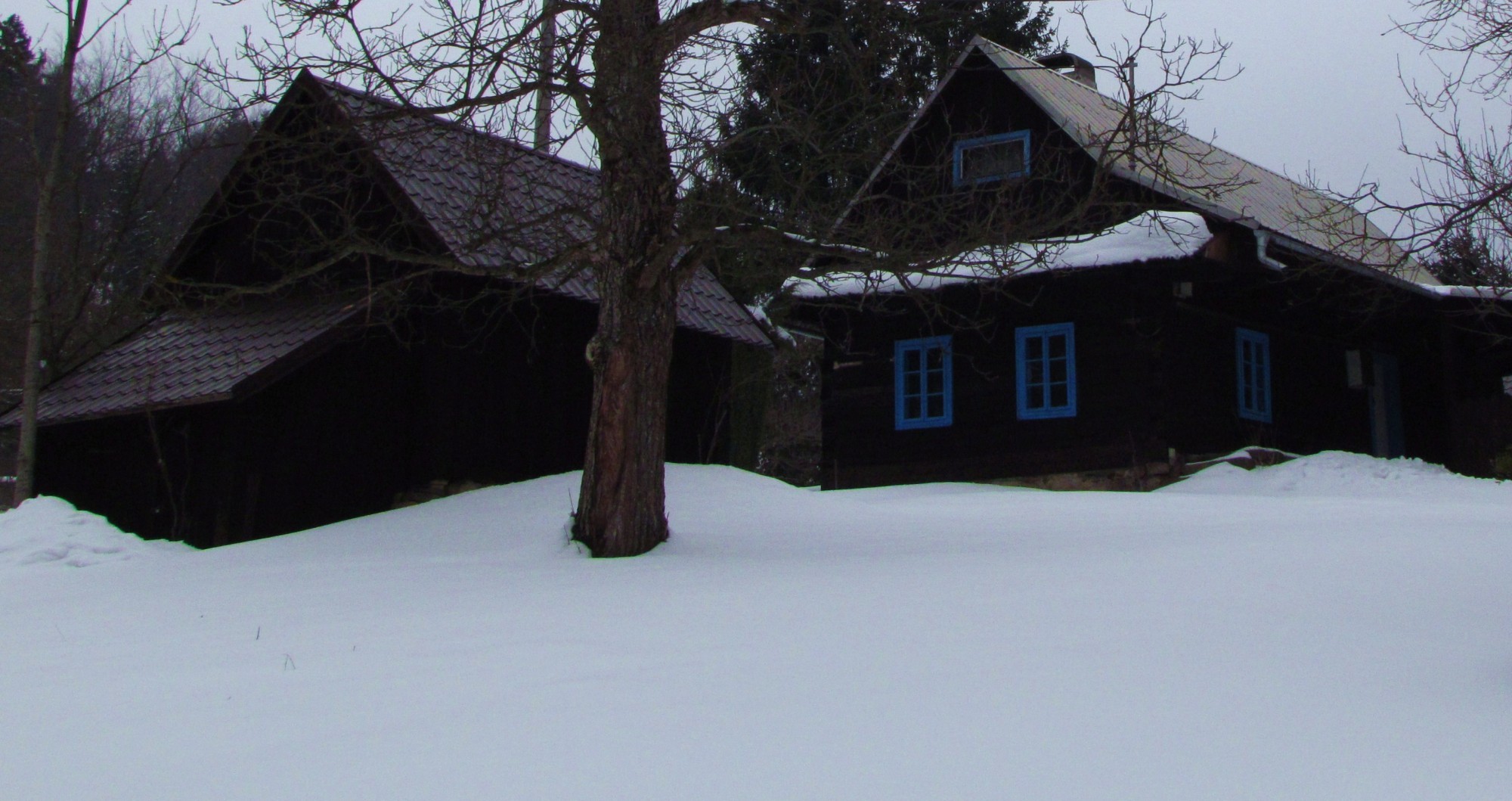 Franta si jako vždy musí udělat odskok za svými milenkami - skálami. My s Katkou zatím pokračujeme údolím kolem rekreačních chalup. kde ho máme čekat. Asi za půl hodiny se naštvaně přihnal, ve svahu bylo totiž po kolena sněhu a skály skoro nebylo vidět. Společně posvačíme štrůdl a kofolu a pokračujeme dál až k dřevěným chalupám s rybníkem. V té záplavě sněhu působí dřevěné stavení jak v pohádce.