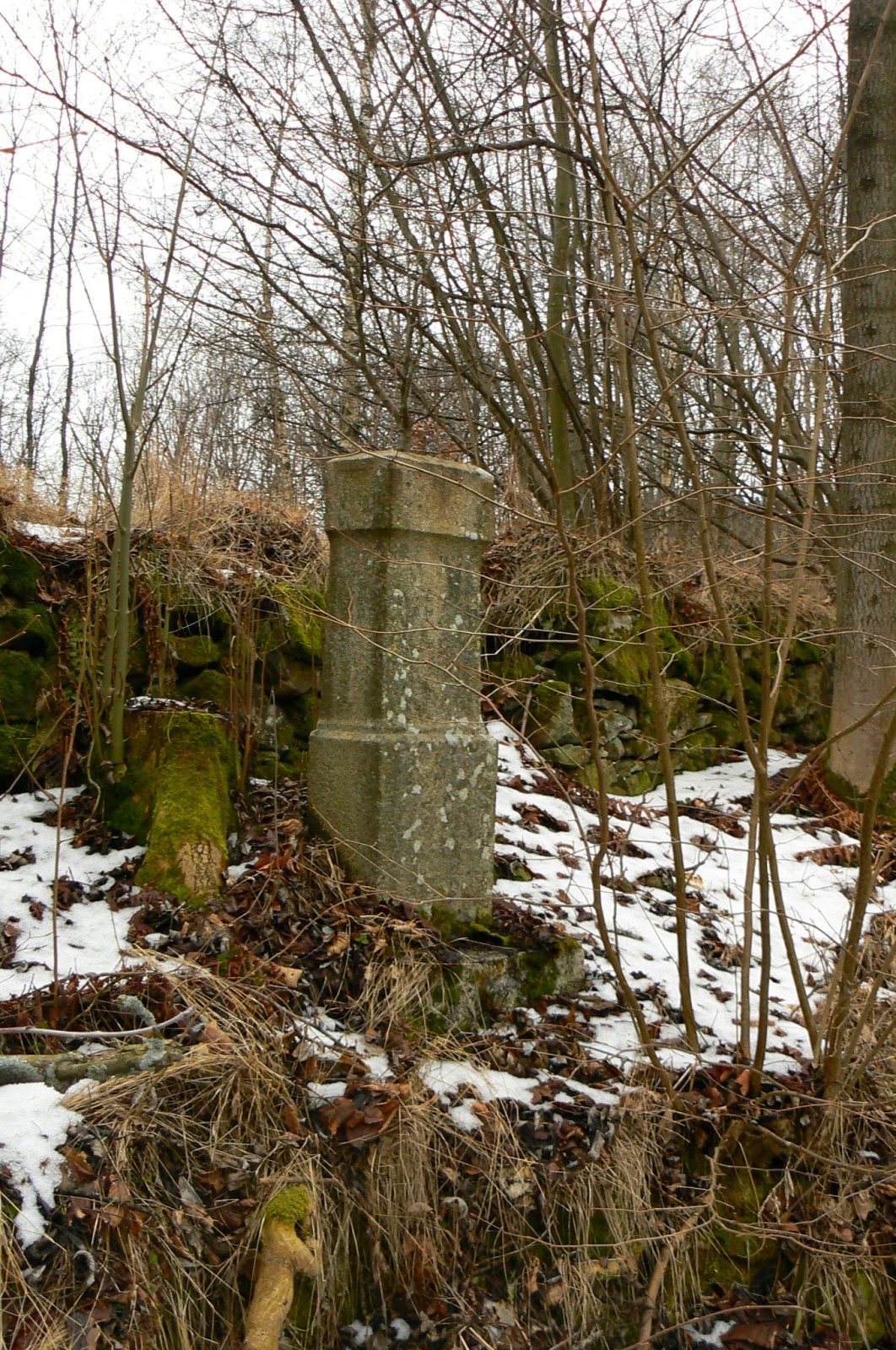 Tady je nově vysázený lesík, na jehož horním okraji, hned u cesty objevíme další kamenný pomník se zbytky křížku.