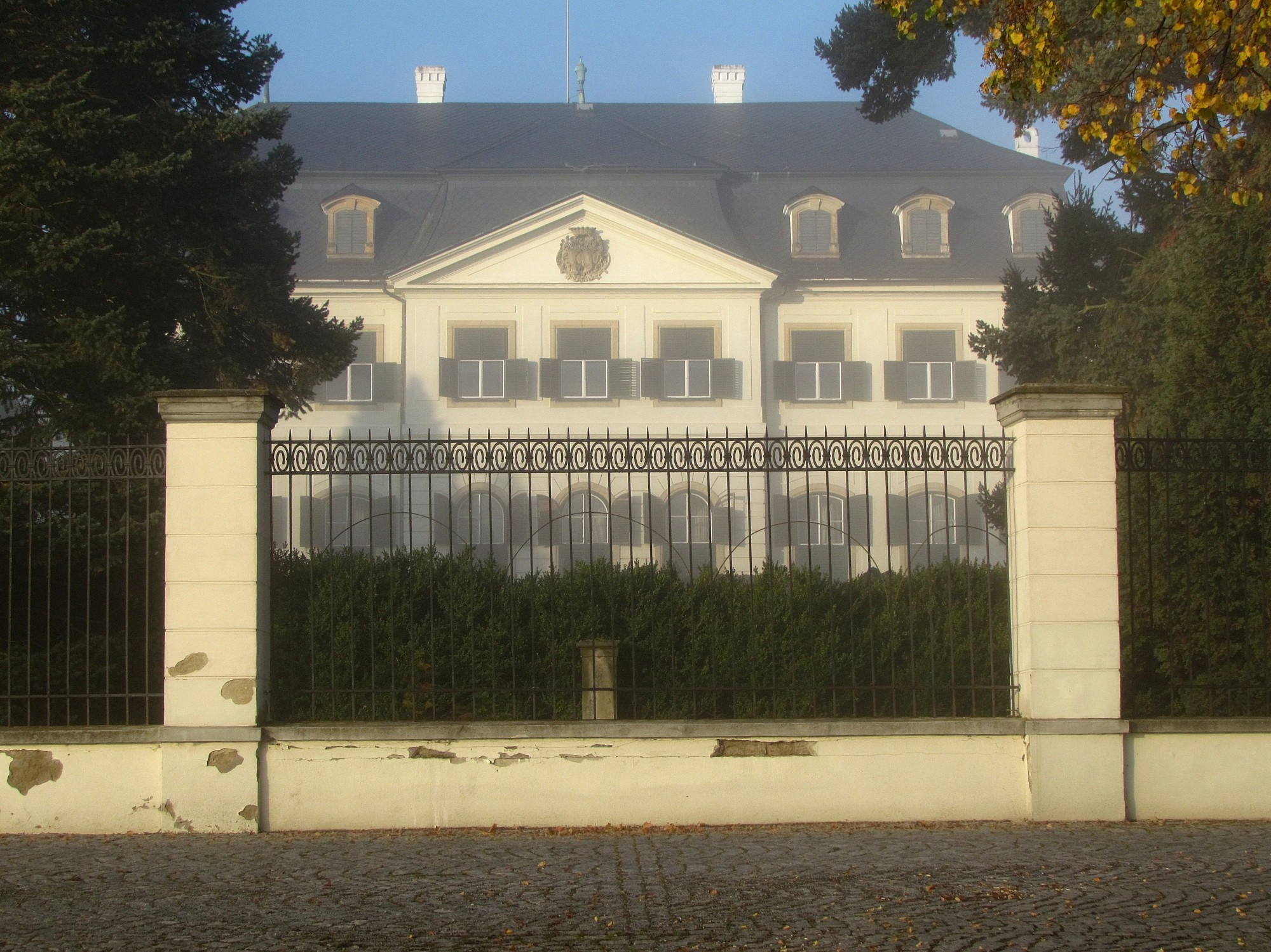 Za nádražíčkem v mlze narazíme na tur.mapu, rozcestník a zelená značka nád napřed vede po chodníku, lemovaném březovou alejí - vrcholky těch nejvyšších stromů už nejsou vidět. Za ní Boží muka a hlavní ulice obce, z ní hned odbočka vlevo nádhernou kaštanovou alejí nahoru do mírného kopce. (Zajímavý fakt, neníliž pravda - kopčiska a Haná, toto spojení k sobě moc nepasuje, že ? Ale ona je ta jejich rovina ohraničena pásy nižších vrchů a z této strany je to doznívající pásmo Zábřežské vrchoviny ). Alej tonoucí v mlze je naprosto fantastická a my se můžeme s Janou ufotit !! O něco výš už vlevo přes opar vidíme málo zřetelný kotouč slunce, které ze všech sil bojuje s neprůhledným vetřelcem a než se mu to podaří, přicházíme v přízračné a snové atmosféře k zámeckému parku. Má velmi neobvyklý půdorys - je kruhový a v jeho epicentru je umístěna hlavní obytná zámecká budova. Už zdálky je poznat, že se její zakladatelé nechali inspirovat "sladkou" Francíí - mansardová střecha, typické okenice ... a stylem baroka. Proti chodu hodinových ručiček mlsně obcházíme oplocení parku se sloupky, za nimiž na nás pokukují místy nádherně nasvícené a místy dosud v mlze tonoucí krásná přírodní zákoutí a přicházíme na travnaté prostranství s kaplí bez věže, parkovištěm a otevřenou zámeckou branou. Zámek má být ale otevřen až od 9.hodiny a je sotva půl ...