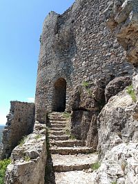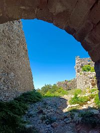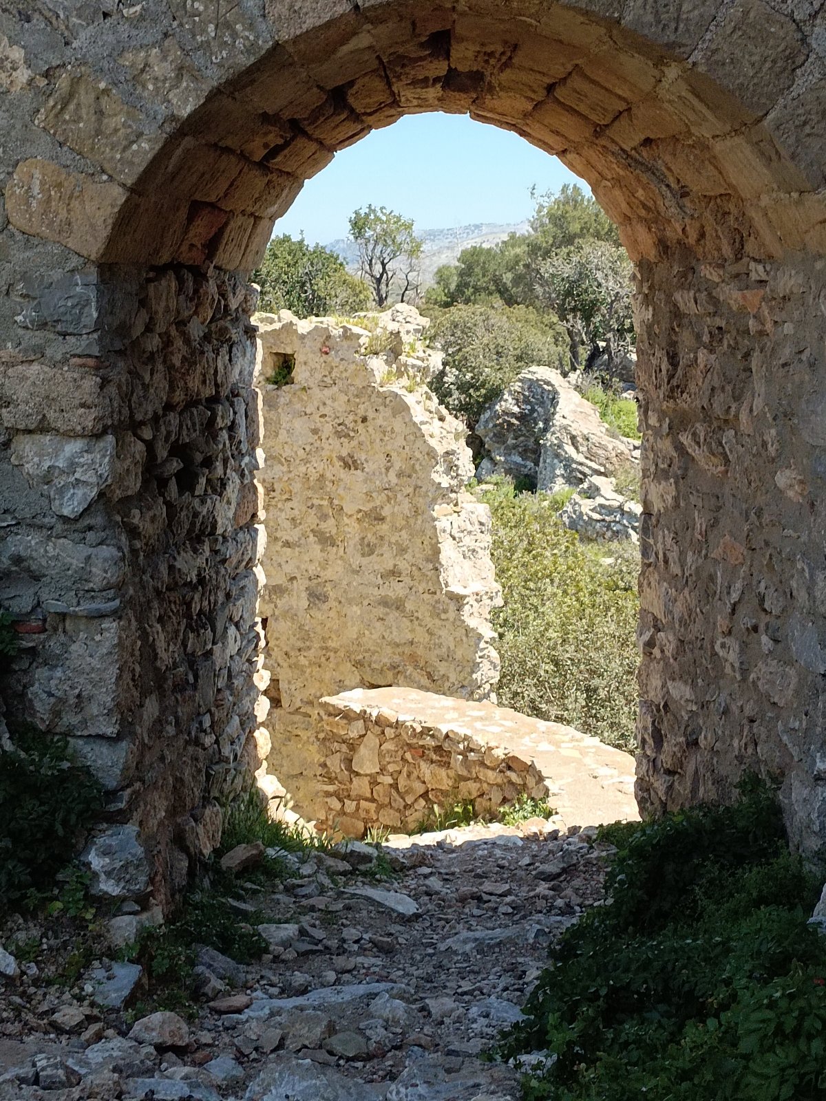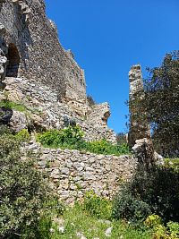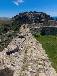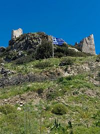 Další zastávkou u západního pobřeží ostrova byl hrad Kritinia. Tohle místo nás okouzlilo. Jde o zříceninu hradu, který na vysoké skále postavili v roce 1472 maltézští rytíři. Prolézali jsme mnoha zákoutími mezi hradbami i po hradbách a obdivovali nádherné výhledy na egejské moře a okolní krajinu. Místa kolem hradeb byla teď na jaře krásně porostlá zeleným býlím- barevnou květen…