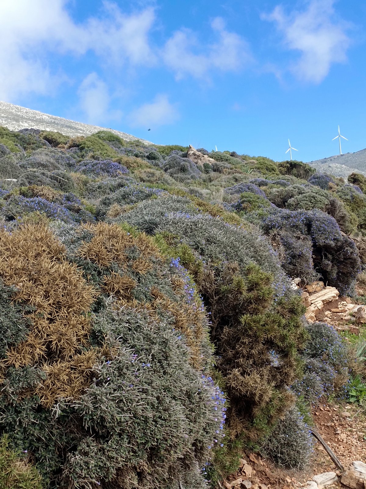 Další zastávkou u západního pobřeží ostrova byl hrad Kritinia. Tohle místo nás okouzlilo. Jde o zříceninu hradu, který na vysoké skále postavili v roce 1472 maltézští rytíři. Prolézali jsme mnoha zákoutími mezi hradbami i po hradbách a obdivovali nádherné výhledy na egejské moře a okolní krajinu. Místa kolem hradeb byla teď na jaře krásně porostlá zeleným býlím- barevnou květen…