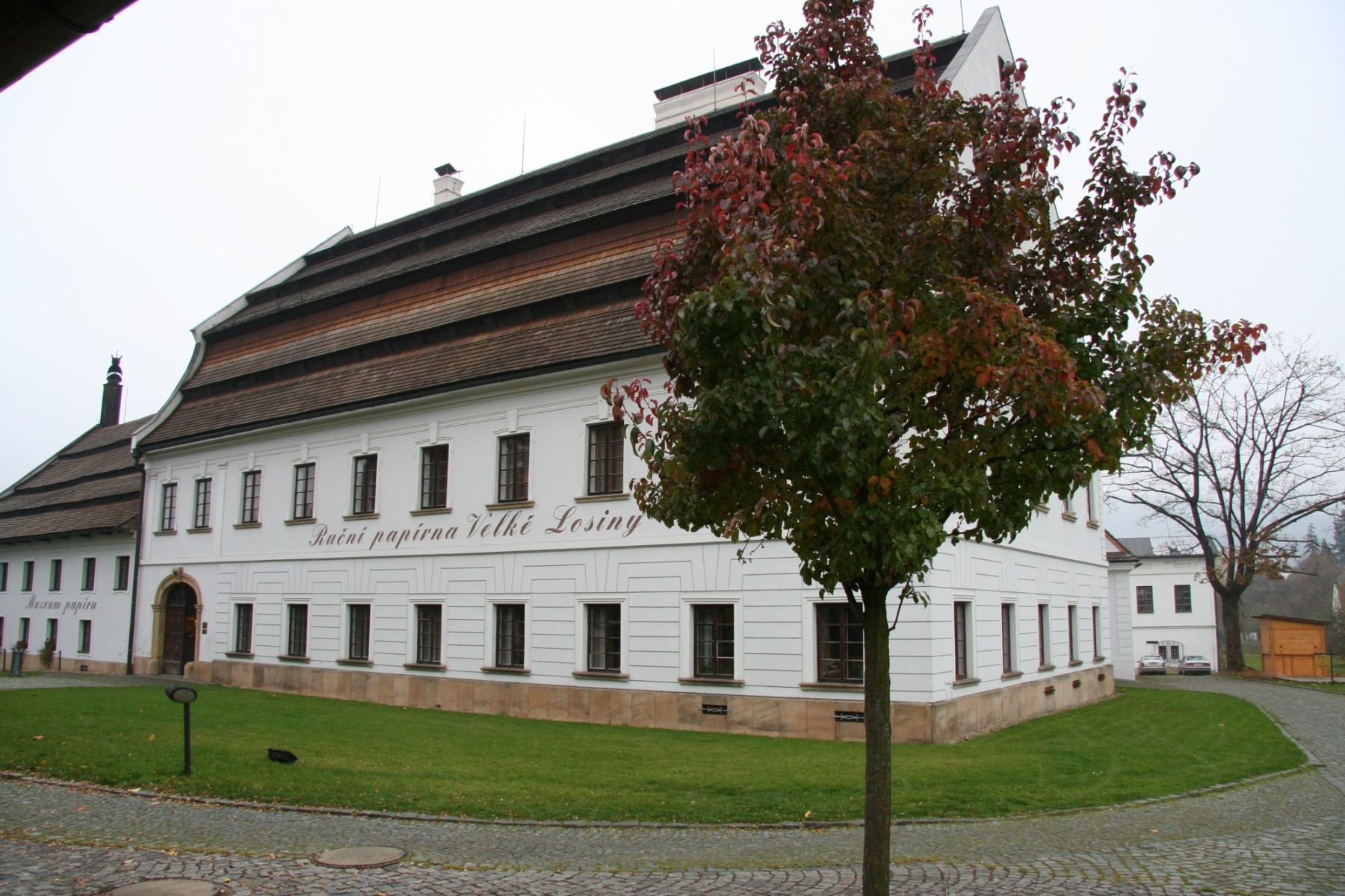 Autem do Velkých Losin na Moravě, parkoviště je přímo v areálu papírny.