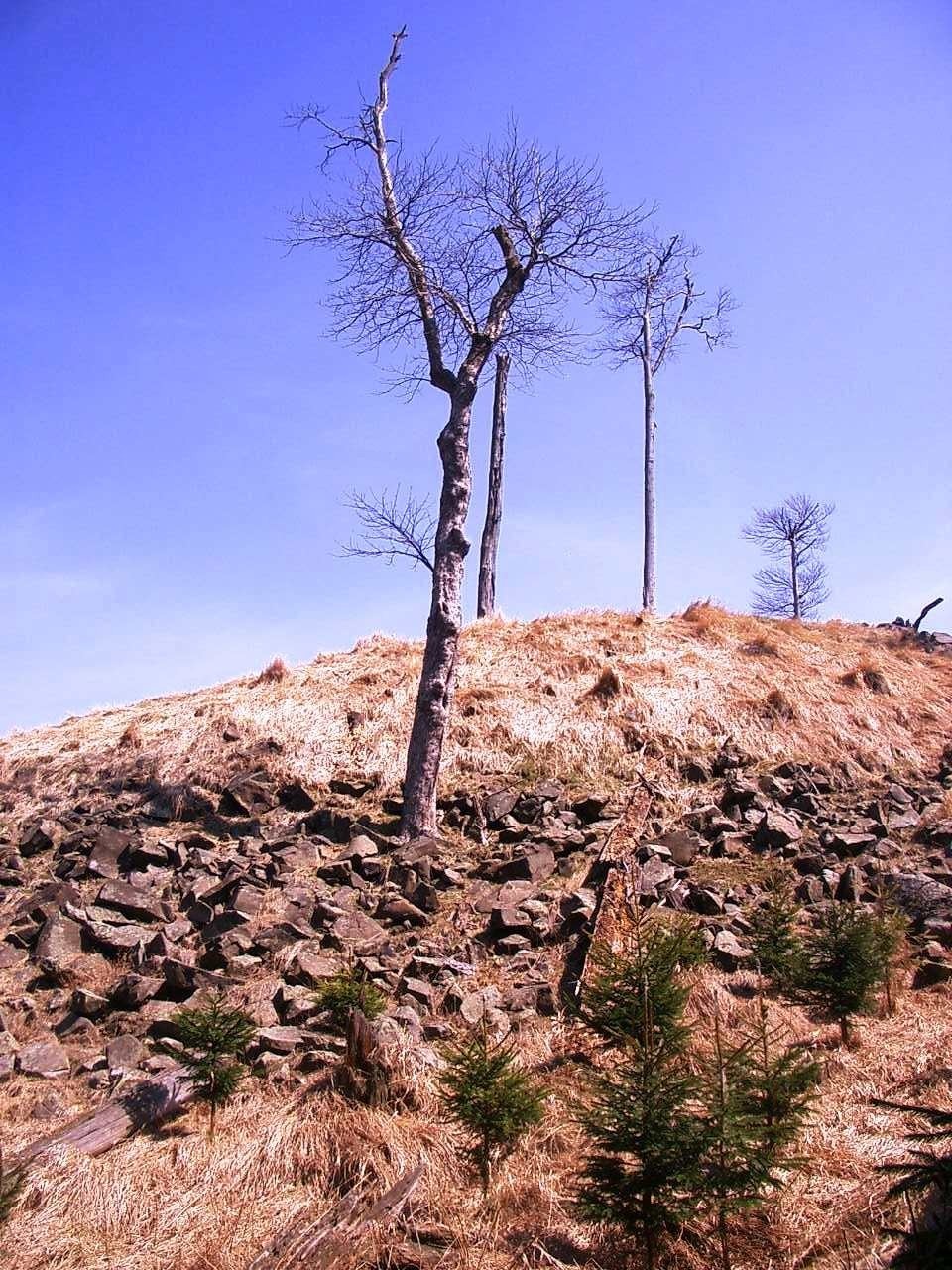 Vydali jsme z Rudolické křižovatky do osady Nový Háj. Je zde kostel a Památník pochodu smrti z r.1945. Šli jsme se podívat na koňskou farmu a zamířili k poslední zemědělské usedlosti / dost špatný stavební stav , ale žijí zde lidé /. Před námi v přímce se objevila lesní asfaltka a protože tenhle kraj jsme vůbec neznali vydali jsme se směrem k hranici. Zajímal nás taky vysílač , který je zde postaven u Kamenného vrchu. Cesta vede tmavým a celkem nezáživným lesem. Přes cestu se párkrát přehnala zvěř. Došli jsme až k vysílači. Je umístěn na kamenném srázu. Vydali jsme se k němu, zda zde nebude vyhlídka. Před námi se objevil, ale jen vršek nějaké skalky. V mapě není zakreslena . Slezli jsme sráz a před námi stála krásna skalnatá holá homole. Vyšplhali jsme na ni a z ní byl krásný výhled do okolí , zvláště na německou stranu a Brandov. Pod homolí jsou zbytky starého lomu.