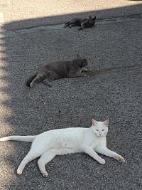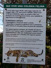 Jásala jsem nad starostlivým přístupem dobrovolníku k toulavým kočičkám. Možná je to velkým množstvím nachozených km cestou necestou, ale spíše je příčinou vzájemná přitažlivost mezi mnou a těmito svobodnýmá vtipnýma svéhlavičkama, že jsem tyto kočičí kolonie nacházela v každém navštíveném místě (v parku, pod hradem, u moře v Algheru...). Kočičky měly vždy trochu v ústraní připraveno spoustu pelíšků, misky s granulema a vodou. Jen krátce překládám ceduli, kterou jsem u jedné z kolonii vyfotila: Podle zákona...ze dne 18.května1994 ...jsou kočky, ať už jednotlivé volné nebo shromážděné v kočičích koloniích, chráněny před jakoukoli formou špatného zacházení....(více viz. foto)