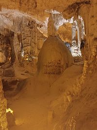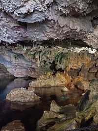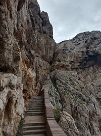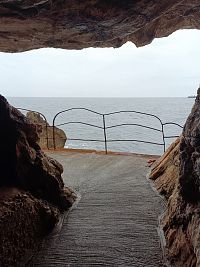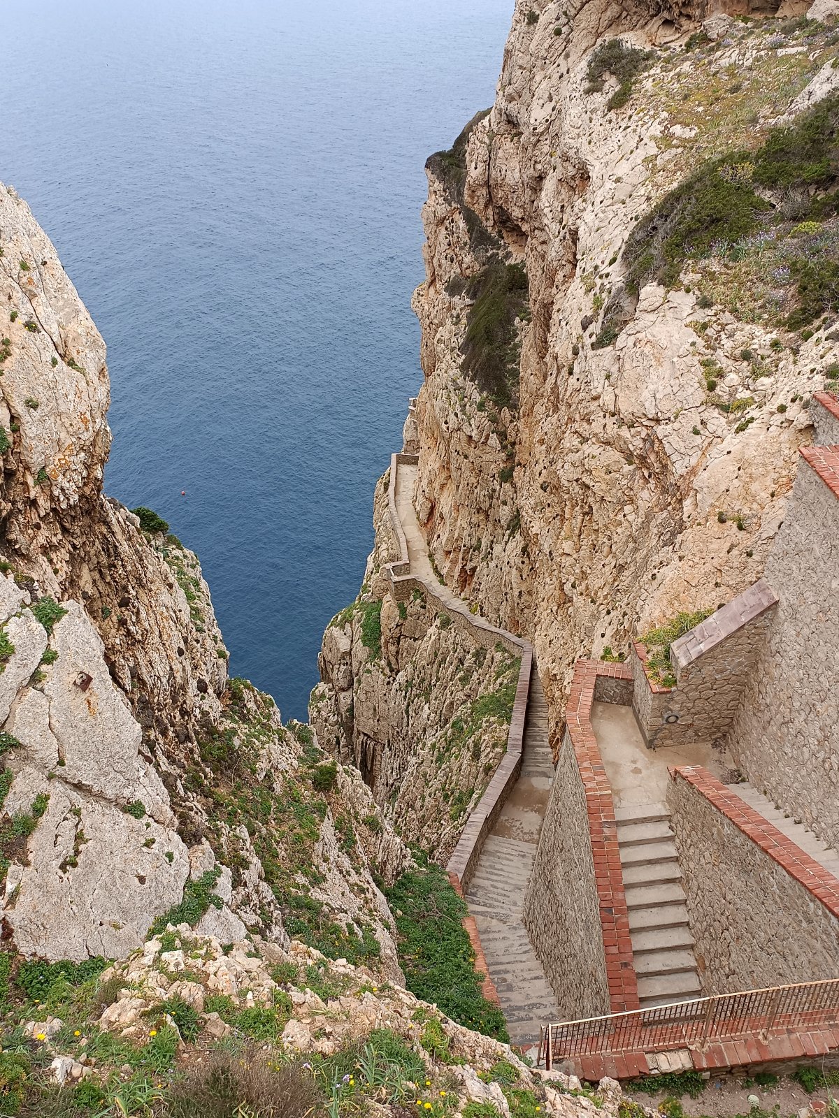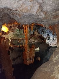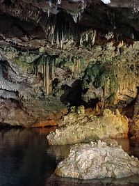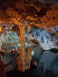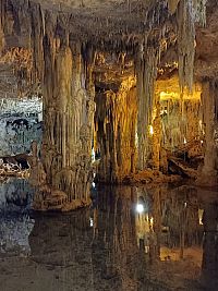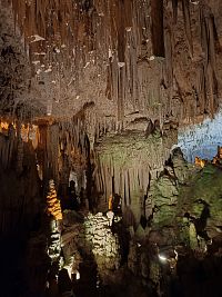 V Algheru (přehledné nevelké autobusové via Catalogna) jsem ráno 9.15 nastoupila na autobus směr Capo Caccia, což je mohutný vápencový masiv, spojený s pevninou úzkou vysokou šíjí, na němž naleznete tuším nejznámější krápnikovou jeskyni- Neptune's Grotto. Podle legendy tady sídlil bůh moří Neptun. Do jeskyně se dostanete po schodech- je jich celkem 660, takže budete mít dost času na obdivování velkolepého skalního masívu a výhledů do širého moře. Kozí schody, jak se jim říká, byly vytesány do skály roku 1954, předtím byla jeskyně přístupná pouze lodí. Jeskyně je dlouhá více než 1 kilometr a kromě tisíců krápníků velkých a miliónu maličkých zde budete žasnout nad rozlehlými vnitřními prostory a mnoha malými i velkými jezírky. Prostě pohádková podívaná. I když jsem navštívila jeskyni mimo hlavní sezónu (přesně 13.4.), sešlo se poměrně dost lidí. Lístek jsem koupila v pohodě na místě, ale přes sezónu určitě rezervujte on line předem. Ještě upozornění pro ty, co pojedou busem. Jelikož jsem zde byla v neděli, poslední autobus zpět do Alghero jel před 12.00. Nevím, jak ve všední dny. Zpátky jsem jela stopem.