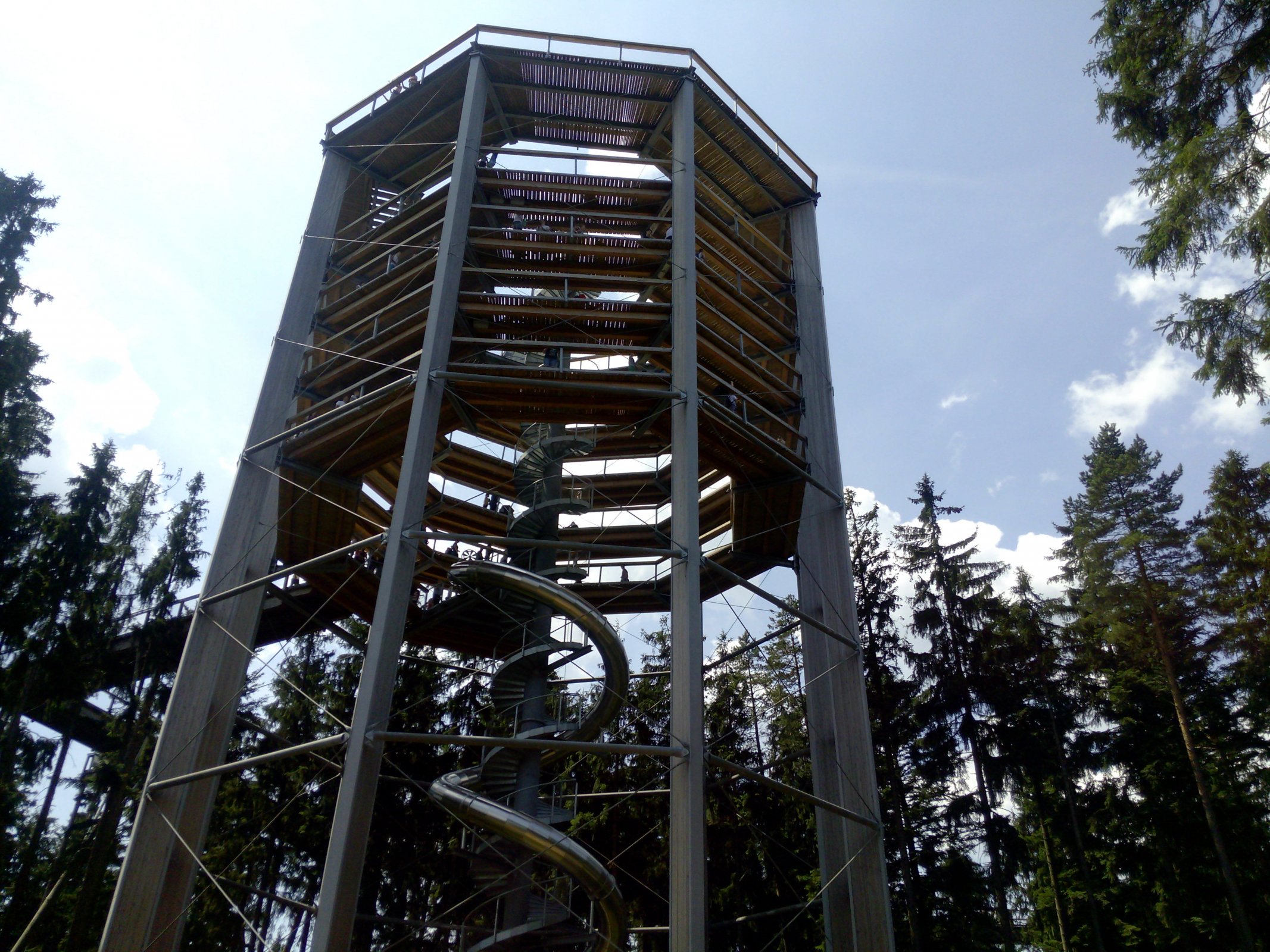 .Vcházíme na stezku a humor mně přechází.Stezka je vedena ve velkém kruhu až pod 40ti metrů vysokou vyhlídkovou věž.Že stoupáme stále výš je poznat podle stromů.Přestože jdu chůzí značně nejistou a křečovitou a bojím se podívat dolů,musím uznat že okolí je úchvatné.Přicházíme pod věž a já vím že to nedám.Starší syn se pokouší přemlouvat se slovy že uvidím Alpy,ale fakt to nejde.Odpovídám už trochu příkře že pokud budu chtít vidět Alpy tak si vezmu auto a pojedu tam!!!