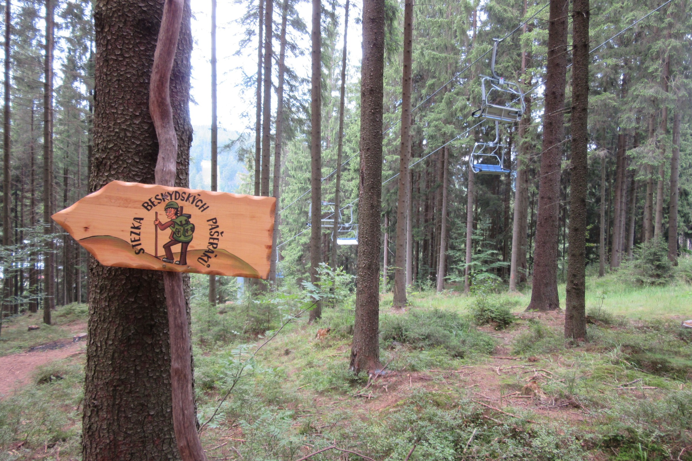 Na stezku sice oficiálně šlápnete nohou až na horní stanici lanové dráhy z Bílé na Zbojník, ale prakticky začíná už u dolní stanice v Bílé. Zde se totiž můžete vybavit pašeráckými pomůckami, abyste během putování po stezce unikli všem nástrahám a bezpečně se dopravili zpět do Bílé. U pokladny lanovky je možné si za poplatek zapůjčit pašeráckou brašnu s dalekohledem a buzolou. My máme dalekohled vlastní a spoléháme na místní značení, tak fasujeme jen Pašerácké deníky, do nichž si děti mohou zapisovat poznámky a plnit úkoly. Poté se necháváme vyvézt čtyřsedačkovou lanovkou na horní stanici Zbojník, která je postavena o 900 m dál a 250 m výš. Zbojník se nachází kousíček pod vrcholem hory zvané Zbojnická (774 m n. m.). Ta je zajímavá legendou, podle níž se zde měli sejít zbojníci Jánošík a Ondráš.