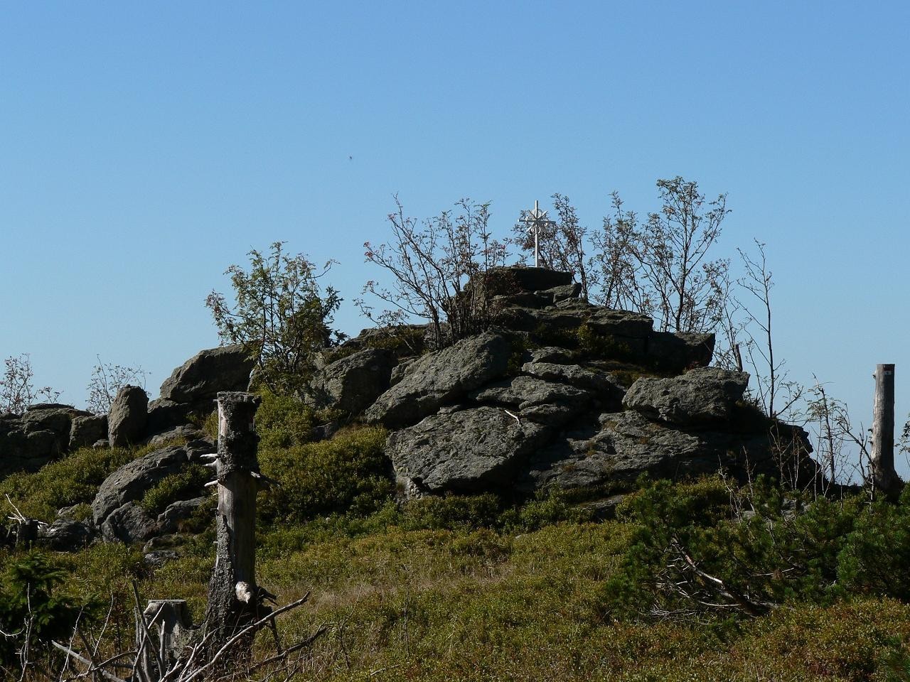 Silnice s bezvadným povrchem začíná již v Bavorské Železné Rudě dlouhým stoupáním. Tento úsek na parkoviště pod Svarohem se jezdí prostě pro radost, i když je to jen 20 minut. Z parkoviště Scheibensalte již pokračujeme po svých. I když vrchol je vzdušnou čarou necelé dva kilometry, čeká na nás zdolání skoro 350 metrů výšky a budeme nahoře. Lze si vybrat ze dvou tras, dáváme přednost té mírnější. Kousek od parkoviště se cesty dělí. Jdeme po cyklostezce doleva. Je to sice trochu delší, ale stoupání není tak strašné. Po necelém kilometru jsme na křížení s červenou a po té se dáváme vpravo. A tady to začíná, po chvilce tempo klesá a následují i přestávky na nadechnutí. Před dvaceti lety to ještě byla sranda. Stromy pomalu řídnou a na vrcholu skoro žádné nejsou. Pohled na skálu s křížem je více než milý. I když k nám do Čech výhled chybí, na bavorskou stranu je to pohádka. Na jihu se zvedá Velký Javor a celý pás vrcholů k jihozápadu. Na západ nejkrásnější dva vrcholy Šumavy Velký a Malý Ostrý, jinak pro Bavoráky Prsa Matky Boží. Turisty zde člověk potká poskrovnu, dnes jsme tu sami. Nedá nám to a jdeme po hranici nahlédnout co se děje v Čechách. Kousek za bývalou Juránkovou chatou to raději vzdáváme, jde totiž o infarkt, a vracíme se do normální země. Dolů jdeme druhou stezkou. Je více kamenitá a přímo padá dolů. Slunce dost připaluje, tak vynecháváme i nedaleký pramen Svarožné a po 4 hodinách jsme na známém parkovišti. Já vím, dalo by se to zvládnout rychleji, ale v takové nádheře se prostě nespěchá.
