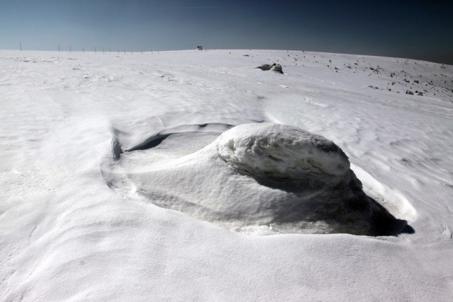 zasněžený hřeben Jeleního hřbetu s bizarními výtvory sněhu a větru, výhled Na Praděd, Petrovy kameny