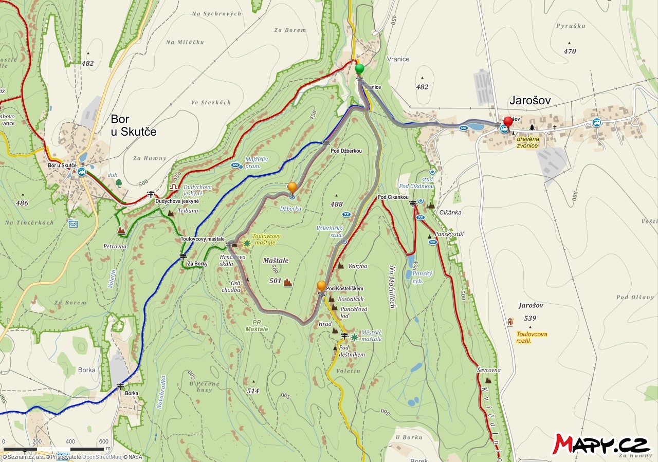 Zaparkovali jsme v Jarošově a odtud se vydali po modré značce směr Vranice. U rozcestníku ve Vranicích pokračujeme po červené značce směr Toulovcovy maštale. Celou cestu máme okolo sebe krásné lesy, pískovcové Skály a spoustu květin. V Toulovcových maštalích se můžete chvíli zdržet, dát si sváču, odpočinout a nebo celou dobu prolézat jednu skalní chodbu za druhou. Pokračujeme dále po červené a na rozcestníku pod Kostelíčkem odbočíme na žlutou, která nás dovede zpět do Vranic a modrá až na výchozí bod v Jarošově.