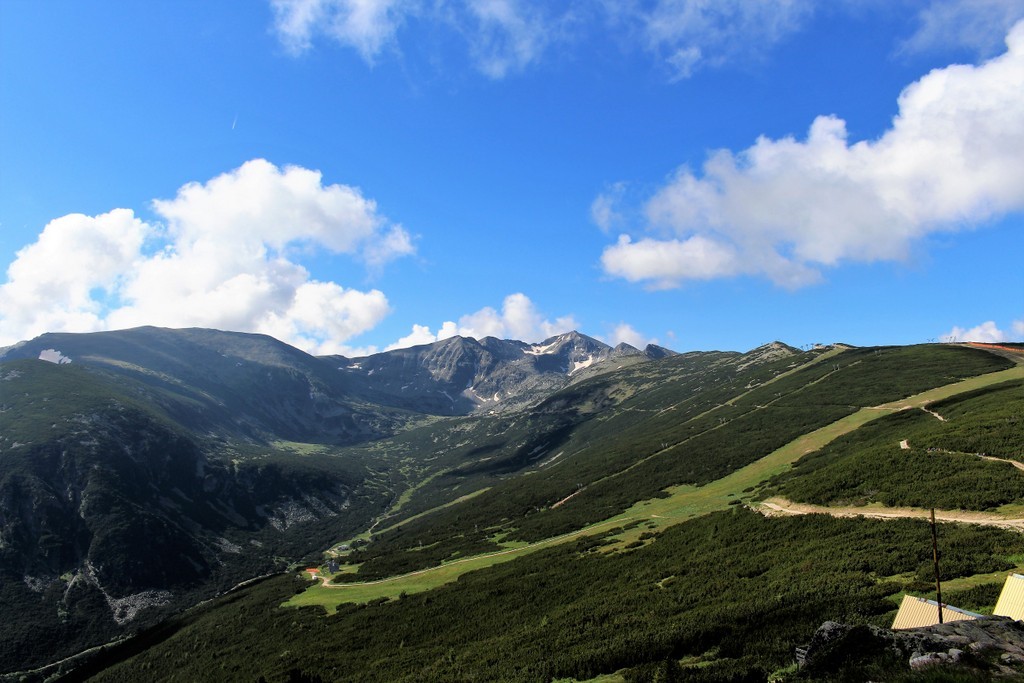 Na otevření pokladny čeká několik turistů a tak zbývá zakoupit jízdenku a čekat. Přesně ve stanovený čas se kabinky dávají do pohybu a po několika minutách se díváme na zelené moře lesů pod námi. Mezi stromy se sem tam objeví malá loučka, potůček nebo skalisko. Je vidět i do kraje na severu a než se stačíme rozkoukat vystupujeme na konečné. Vycházíme z budovy a nad námi je modrá obloha s bělavými mráčky a sluníčko už docela slušně hřeje. Pod svahem se otevřela zcela neznámá krajina. Díváme se do hlubokého, zeleného údolí a na svahy porostlé klečí. O něco dál je vidět několik vrcholů, kterým vévodí vytoužená Musala. Sestupujeme k cestě, u níž je směrovka s nápisem „ Peak Musala“. Cesta je zaříznutá do svahu a prvních několik set metrů se jde skoro po rovině. Přecházíme několik sjezdovek, nad kterými se pohupuje sedačková lanovka. Okolí je více než nádherné a včera zmoklé trsy rostlin se nám předvádějí v celé kráse. Prostě nádhera.